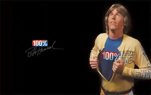 Bien qu’au début la marque ne proposait que quelques produits (guide câble, tee-shirt autocollants..), le logo 100% a alors commencé à apparaître sur le maillot, le casque, la moto ou le pare-pierre des meilleurs pilotes de l’époque : Bob Hannah, Ricky Johnson, Johnny O’Mara, David Bailey, Jeff Ward… et le tout sans aucun contrat signé avec ceux-ci, voir même sans aucune contrepartie financière. Inimaginable à notre époque !