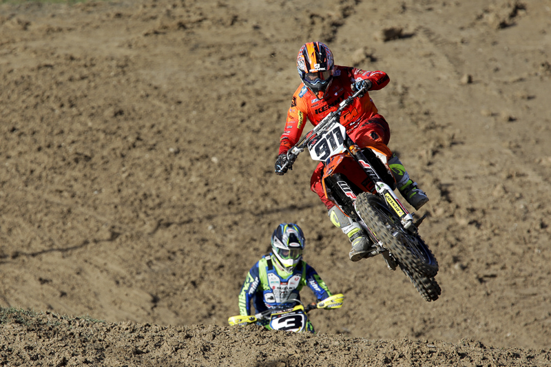 Profitant d’une pause entre deux Grands Prix, Jordi Tixier (VHR KTM) n’a pas fait dans la dentelle pour s’imposer sur le très rapide et technique circuit du Val D’Ouve. Deux manches, deux confortables victoires ! Très à l’aise dans les nombreux virages relevés, passant facilement d’une trace à une autre, il a écrasé la concurrence dès les chronos en étant deux secondes plus rapide. Il s’est emparé de la tête dès la fin du premier tour lors de la première manche après une légère résistance de Nicolas Aubin (OB1 Motorports Suzuki) pour terminer avec plus de trente secondes d’avance. Le début de la seconde manche a été un peu plus compliqué car, parti cinquième, il a fallu six tours au Champion du Monde MX2 2014 pour se défaire successivement de Guillod, Clochet, Desprey puis Aranda pour l’emporter. A la deuxième de l’épreuve on retrouve un autre pilote qui n’avait rien à jouer au Championnat en la personne de Valentin Guillod (FR25 Honda). Le Suisse (2-3), récemment sélectionné pour représenter son pays au Motocross des Nations, a réalisé deux manches très solides. Lors de la première, il est parti dans le Top 5 et a attaqué très fort pour passer troisième dans le premier tour. Il s’est ensuite défait d’Aubin au tiers de la course. Son deuxième départ a été moins bon et il a eu du mal à se mettre dans le rythme en début de course. Trouvant les bonnes traces, il a fini très fort, se payant le luxe de menacer la deuxième place de Desprey en échouant dans sa roue après avoir été gêné par des retardataires.