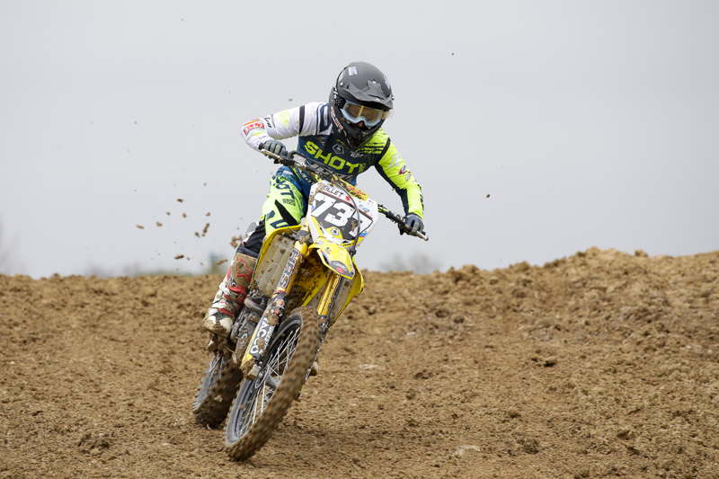S’il a mis un peu de temps en début d’année à s’acclimater à sa nouvelle monture 250 cc JPM Racing Suzuki, Valentin Teillet est clairement en pleine confiance ces derniers temps. Le Vendéen remporte l’épreuve malgré une concurrence très relevée. Sa première sortie de grille n’a pas été idéale mais il a réussi à mettre un rythme énorme lors du premier tour pour passer cinq pilotes puis placer une attaque contrée par Rubini pour le gain de la deuxième place. Brian Moreau n’a pas pu résister longtemps au duo qui a mené la course a un rythme infernal, Rubini en tête. A quelques minutes de la fin, Teillet a bien tenté une nouvelle attaque à la faveur du retour sur des retardataires mais le coleader du Championnat d’Europe a résisté pour s’imposer. En deuxième manche, Teillet a pris les commandes de la course dès le second virage et a profité d’un départ moyen de son adversaire pour s’échapper en tête et gagner sans trop être inquiété. Stephen Rubini se classe deuxième de la journée car, après sa victoire conquise de haute lutte, il n’a pu sortir de grille mieux que septième et a mis du temps a dépasser lors des premières boucles . Peu après la mi course, à l’attaque sur Moreau pour le gain de la deuxième place, il a chuté en recoupant la trace en sortie d’un virage relevé négocié sur l’extérieur. Reparti cinquième, il ne pourra pas regagner de position mais reste virtuellement en tête du Championnat à la faveur des reports de points.