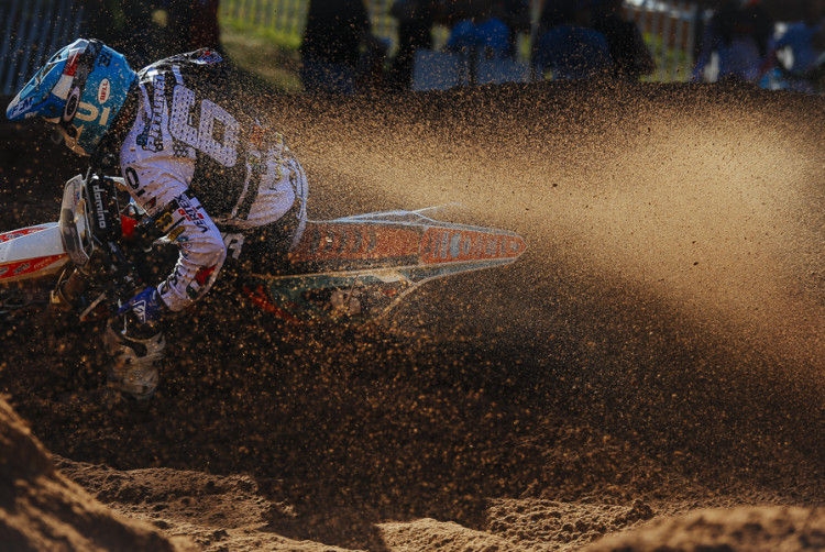 Valentin Teillet (VRT 3AS KTM) complète le podium de la journée en ayant animé le début de la première manche grâce à un holeshot. Toujours un peu en manque de rythme et peu à l’aise sur le sable, il a néanmoins bouclé cinq tours en tête avant de baisser de rythme. Le départ de la seconde course fut un peu moins bon et, pris dans le peloton, il a réussi à revenir quatrième, menaçant Aranda dans les derniers tours. Le Belge Damon Graulus (JPM Racing Suzuki – 4-5), pourtant sur un terrain plutôt avantageux pour lui, ne peut faire mieux que cinquième de la journée. La faute à un départ moyen en première manche et à une chute en seconde alors qu’il était solidement accroché à la troisième place. Il devance au final un Nicolas Aubin (Amexio Suzuki -6-6) un peu moins à son avantage sur le sable et un Jason Clermont (Kawasaki – 7-7) toujours bien placé.