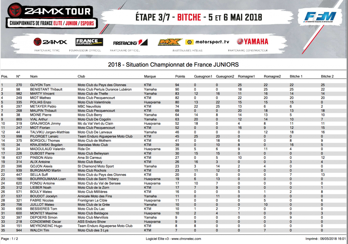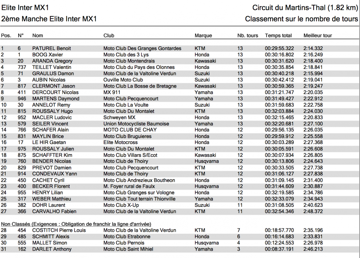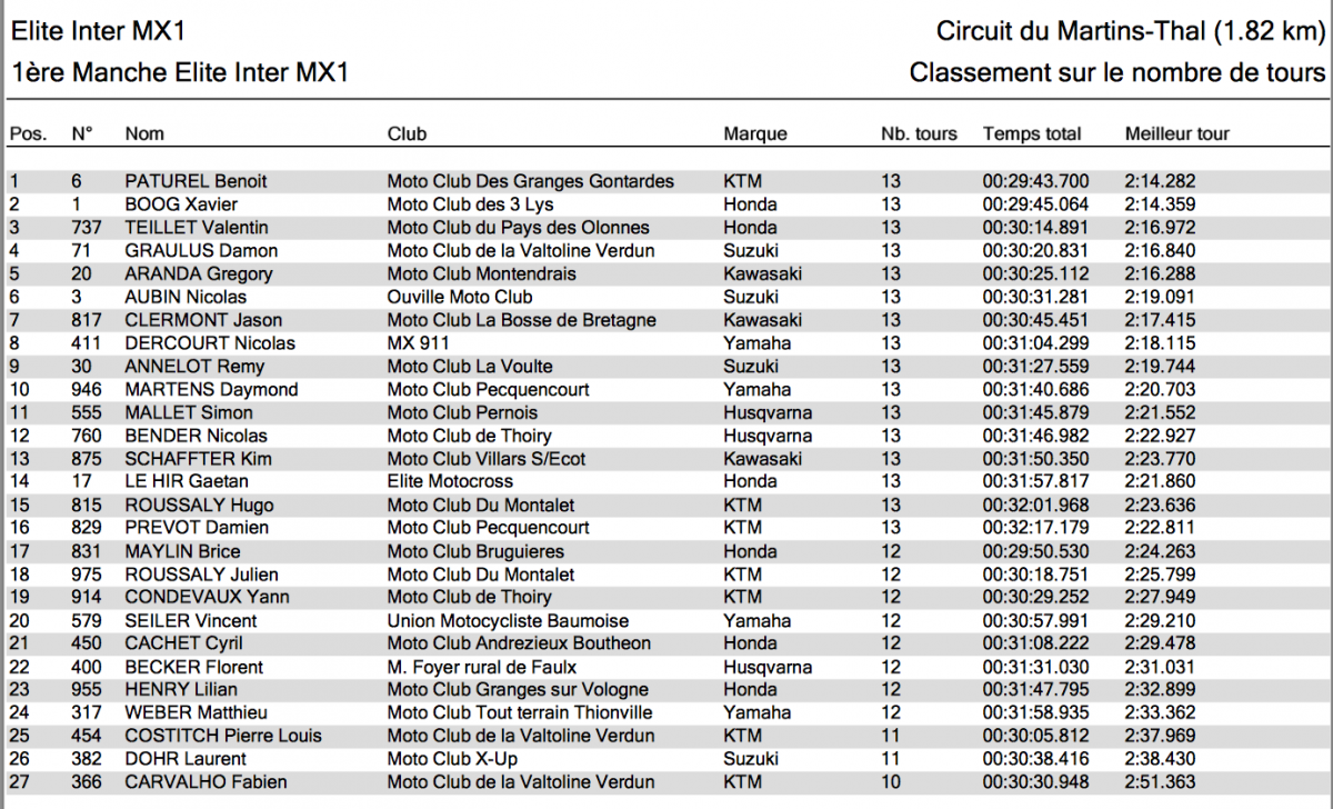 Depuis le début de la saison Thibaut Benistant (Yamaha MJC) et Tom Guyon se rendent coups pour coups en France comme en Europe. Cette fois-ci les deux pilotes n’ont pu se départager, remportant une manche chacun et finissant l’autre à la deuxième place. Le pilote VRT 3AS KTM remporte l’épreuve au bénéfice de sa victoire en seconde manche. Il a réalisé le holeshot de cette course et n’a pas été inquiété, reléguant Benistant à vingt secondes. En première manche c’était Benistant qui avait réalisé le meilleur départ tandis que Florian Miot (Motoblouz HB Racing) et Pierre Moine (Berryli4ni Yamaha) s’accrochaient et repartaient loin derrière. Guyon se plaçait en deuxième position dès le premier tour mais n’allait pas parvenir à suivre le rythme du leader. Il s’empare de la plaque rouge de leader du Championnat avec quatre points d’avance sur Benistant.
