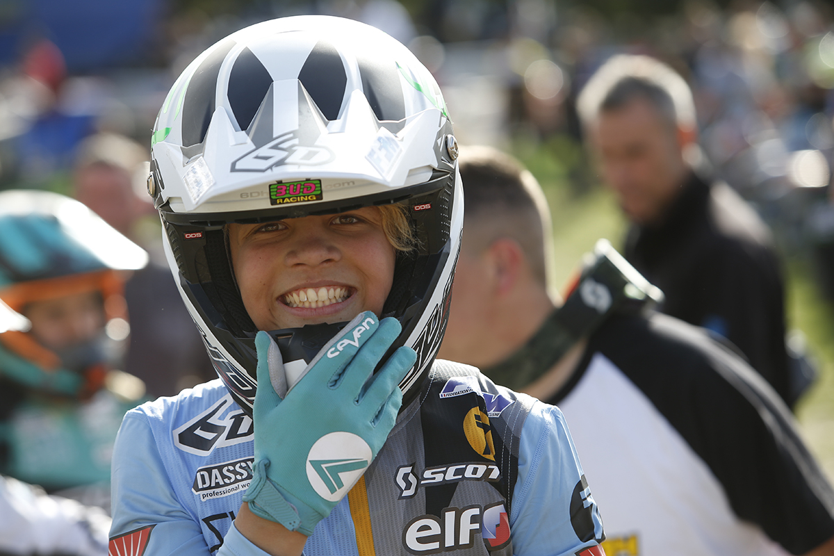 Troisième du Championnat Espoirs 85cc 2017, Quentin-Marc Prugnières a été tenu à l’écart des circuits durant toute la saison dernière à cause de problèmes de santé. A presque 14 ans, c’est donc un nouveau départ qu’il a pris cette saison en rejoignant Bud Racing Kawasaki et en s’adjugeant les services de Steven Frossard pour s’entraîner. Et les résultats ne se font pas attendre ! Il s’impose dans le Tarn grâce à une victoire de manche suivie d’une seconde place. Dans les deux courses le scénario a été identique. Sorti de grille entre la dixième et la quinzième place, il s’est placé dès le premier tour derrière Maxime Grau (359) et Alexis Fueri (KTM). Si dans la première manche il a réussi a remonter petit à petit pour prendre la tête peu après la mi-course, il n’a pu combler son retard sur Grau dans la seconde. Retardé dans les premiers tours par Diego Haution (KTM), il échoue à cinq secondes du leader. Victime de problèmes d’échappement sur sa moto en première manche, le Lyonnais Maxime Grau n’a pu résister au retour de ses poursuivants lors de la manche inaugurale. En réalisant le holeshot de la seconde, il s’offre la deuxième place de l’épreuve. De bon augure pour le pilote Tech32 KTM.