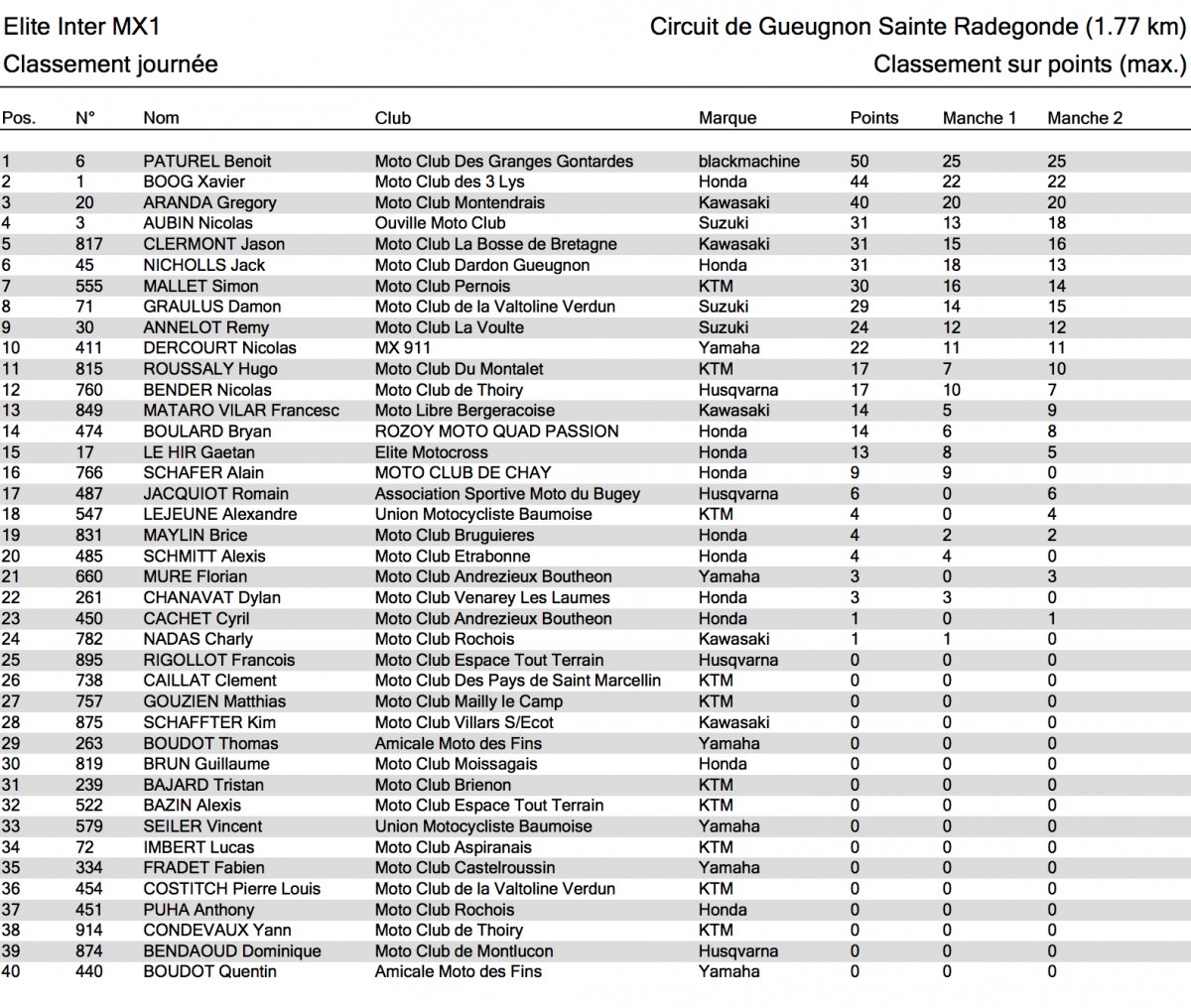 Avec sa pôle au chrono, Benoit Paturel partait en favori. Le Lyonnais a tenu son rôle avec deux victoires de manche à son actif, mais son après-midi bourguignon ne fut pas une promenade de santé pour autant. Car Xavier Boog a fait honneur à son numéro 1 en le titillant joliment en première manche. Mieux, il l’a même accroché et aurait pu prétendre à la victoire sans un retardataire engourdi par le froid régnant sur la région. Même belle prestation en seconde manche où l’Alsacien est revenu d’une cinquième place pour finir second en passant du gros calibre, Simon Mallet, Greg Aranda et Nico Aubin. On l’imagine déçu de ne pas avoir pu se venger de la première même si son adversaire du jour ne s’estimait pas à son vrai niveau lors de la première manche… Le pilote Honda devance en tout cas au terme de cette journée Greg Aranda, retrouvé sur sa Kawa et solide à chaque manche et Nicolas Aubin qui a dû cravacher d’un départ moyen lors du premier débat. A noter la participation de l’Anglais Jake Nicholls venu se préparer pour son championnat national après une longue pause forcée et 6e au final.