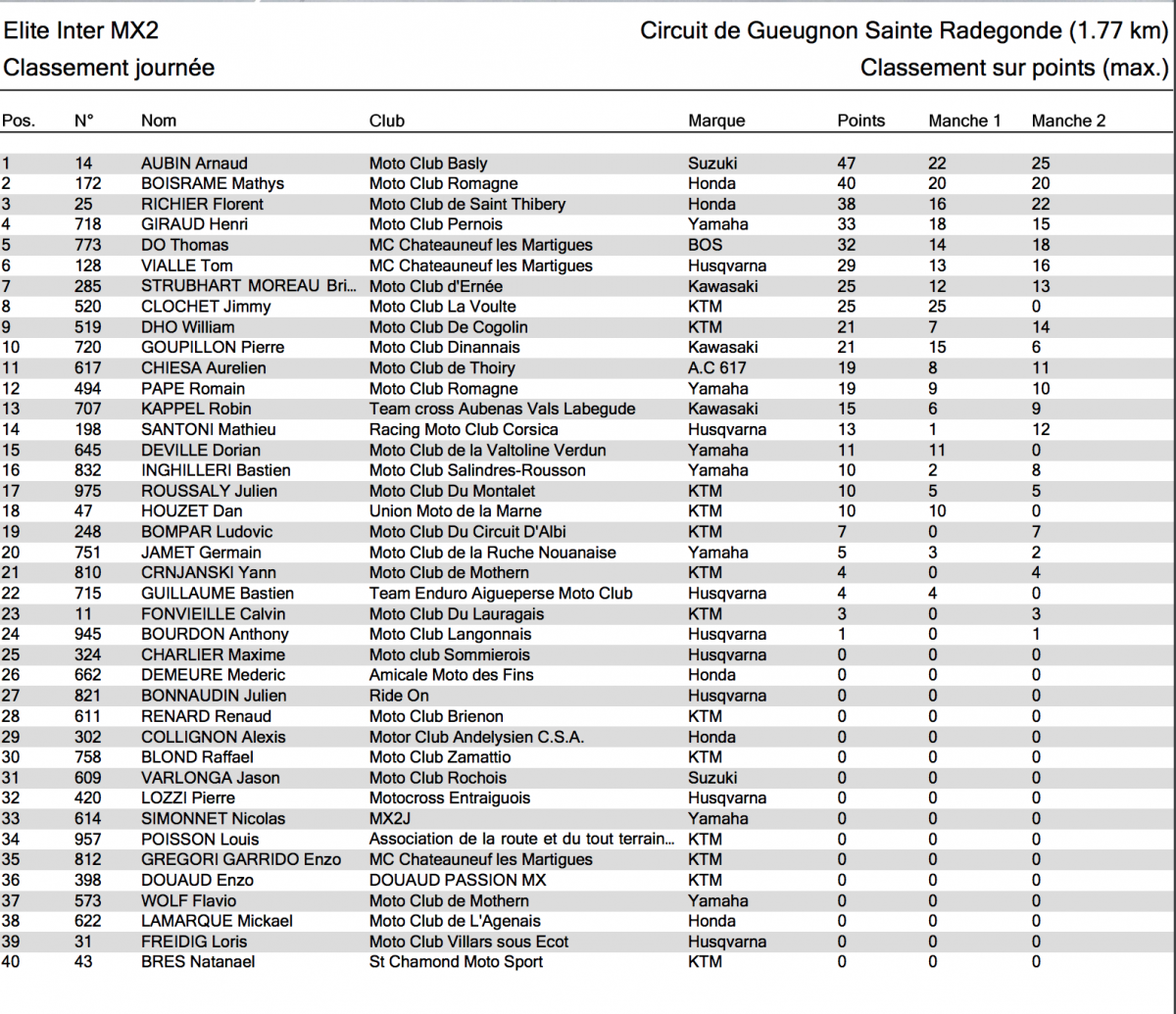 Le pauvre Jimmy Clochet qui avait signé une première manche de folie après un départ en tête et un cavalier seul impérial (en plus d’une pôle !), tenant à distance Arnaud Aubin, Tom Vialle et Mathys Boisramé, aurait pu connaître une journée de rêve sans une grosse chute au second départ. Idem pour Pierre Goupillon qui menait la deuxième manche avant de chuter et de remonter sur sa machine en queue de peloton. Du coup, c’est Arnaud Aubin qui a vécu une belle première dans le Morvan. Solide en première, il a ensuite mené la seconde avec une belle autorité après la chute du pauvre Goupillon pour mener les débats et tenir à distance les copains, Thomas Do, qui se fera manger par Florent Richier en fin de manche, et Mathys Boisramé, ralenti par un calage à mi-course. Belle prestation également de Henri Giraud qui bataillera avec la bande dans chaque débat pour pointer désormais à la 4e place du provisoire et pour Tom Vialle qui aurait pu lui subtiliser la place sans une chute en première alors qu’il tenait une belle troisième place.