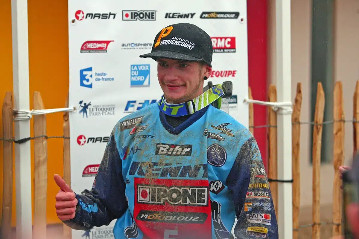 C’est là que les choses se compliquent pour le petit belge qui voit le triple vainqueur de l’Enduropale, Adrien Van Beveren enclencher la surmultiplié et grignoter les secondes par grappe. 30 secondes, 25, 20, l’écart qui sépare les deux hommes fond comme neige au soleil pour se réduire à 18 secondes à l’entame de la dernière boucle. Le final s’annonce grandiose, surtout qu’AVB poursuit son effort pour pointer le museau de sa Yam dans l’aspi du leader. La tension est à son comble, le public gonflé par un Magnanou des grands jours pousse l’enfant du pays qui revient même jusqu’à 5 petites secondes du leader, sous pression. D’ailleurs il se couche dans un virage. Et c’est là que le plus étonnant se produit. Sans doute surmotivé par la perspective de placer une attaque sur le belge, Adrien Van Beveren croise les skis lors d’un freinage, se couche et cale sa moto… Qui ne repart que péniblement. Le chat n’a pas mangé la souris ! C’est elle qui remporte ce 42e Enduropale avec la manière. Et beaucoup d’émotion. A 21 ans, il vient de vaincre ce qu’il estimait sa principale faiblesse, un manque de confiance en lui et peut maintenant, rêver à d’autres victoires ! Une bonne affaire pour Yamaha qui vient de signer sa sixième victoire consécutive sur la Classique nordique.