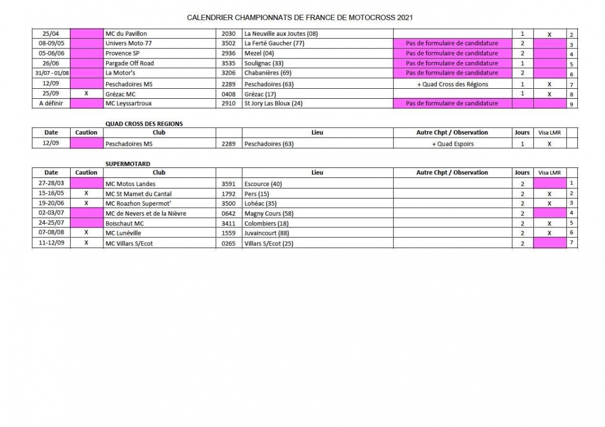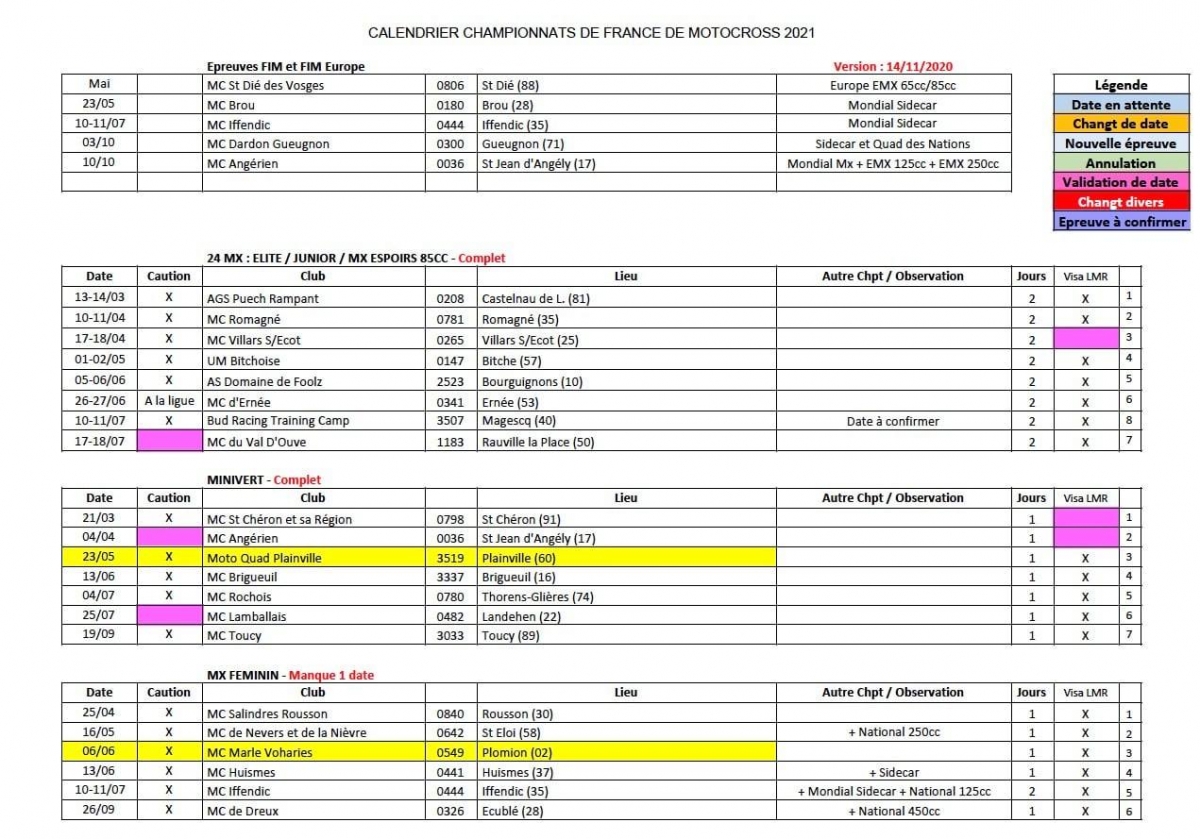 Covid ou pas, il faut bien planifier l’année 2021, ce que la fédération a fait en dévoilant ces calendriers 2021, évidemment très provisoires jusqu’à preuve du contraire… Du classique en ce qui concerne le 24MX Tour, qui visitera Castelnau de Lévis, Romagné, Villars sous Ecot, Bitche, Foolz, Ernée, Magescq et Rauville la Place. Pourvu que ça tienne !