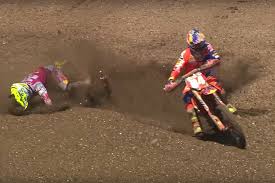 « En fait, je décompose l’attaque de Herlings en deux temps. La première fois, lors du freinage, il tape dans Cairoli en entrée de virage pour le pousser. Une manœuvre virile, mais correcte selon moi. Ils sont dans leur dernier tour, la victoire est là, c’est du motocross, ça n’a rien de surprenant de le voir tenter un truc. Et ce n’est pas si trash, surtout si l’on compare avec la scène US où là, les mecs se coupent en deux. En revanche, là où je trouve qu’il abuse, c’est lors du second contact. Même s’il est déséquilibré, il va percuter Cairoli, qui chute, et là, ce n’est pas trop correct. Ce qui me gêne en fait dans cette action, c’est qu’Herlings est plus rapide et qu’il n’a pas besoin d’aller au contact pour passer l’Italien. Il aurait pu attendre encore un peu et placer une belle attaque bien propre et imparable. Dans la deuxième manche, là, il n’y a rien à dire. Ils sont tous deux en pleine vitesse, Herlings parvient à le tasser à l’extérieur en recoupant légèrement sa trajectoire, sans le toucher, c’est du beau motocross. Rien à dire. Mais pour tout te dire sur cette histoire, j’en ai un peu rien à faire. C’est deux là sont actuellement dans un autre championnat tellement ils roulent devant. Pour ma part, j’essaye de m’inspirer de leurs techniques pour m’améliorer et rouler plus vite. Il y a tant à apprendre d’eux, surtout pour moi qui n’ai jamais été à leur niveau. Je les prends en exemple et voilà tout.