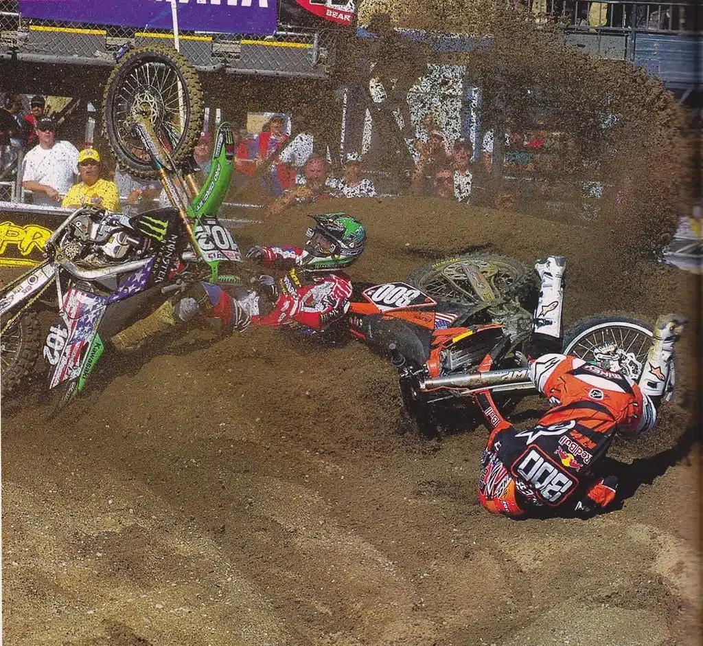 En 2005, Mike est rookie et fait plus que bien. Deux victoires, deux autres podiums dans une catégorie avec des calibres comme Broc Hepler, Davi Millsaps, Mike Brown, Grant Langston, Josh Grant, Danny Smith, Ivan Tedesco… Et justement, Tedesco, déjà vainqueur en SX cette saison, profite de sa régularité pour prendre fermement en main un championnat dont visiblement personne ne veut, tant les cadors font preuve de hauts et bas. Avant la finale de Glen Helen, il possède un tapis de 35 points d’avance sur Mike Alessi. Autant dire un parachute ! Seulement, la chaîne de la Kawa PC décide de casser en première manche, au plus mauvais moment. Et Alessi, dont Glen Helen est quasiment le terrain d’entraînement, ne rate pas l’occasion de remporter la manche, non sans là aussi une belle controverse, après des accrochages à répétition avec Grant Langston. Le Sudaf’ finit par carrément couper un virage pour tenter de découper le jeune rookie de chez KTM. Bonne ambiance. Finalement, GL est logiquement déclassé.
