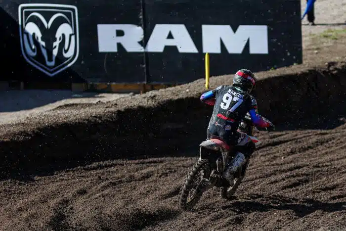 Le lendemain, c’est sur un circuit très arrosé que s’élance cette manche d’EMX125 à Arco, avec le holeshot pour le Français de chez MJC Yamaha Mano Faure, de Bellei et Rispoli. Malheureusement, Mano Faure va partir seul à la faute dès le deuxième tour, et perdre beaucoup de temps pour repartir. Devant, Francesco Bellei tient le rythme, devant le Hongrois Noel Zanocz, le leader du championnat. Mais c’est bel et bien le pilote Fantic officiel, Simone Mancini, qui remporte le général grâce à une belle troisième place en deuxième manche, sa première en EMX125. Il gagne devant Max Ernecker et Brando Rispoli. Mano Faure, reparti à l’attaque, rentre dans le top 10 juste devant Amaury Maindru. 21e place de Liam Bruneau, qui ne ramène donc pas de points de cette course EMX125 d’Arco malgré avoir montré de belles choses. Le métier qui rentre…