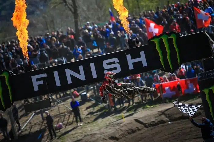 Cette fois, avec un hiver complet au boulot sous l’oeil expert de Corrado et de son fils Marco, ce n’est plus le même Fuéri qu’on a sous les yeux. Déjà très rapide lors de l’ouverture en Angleterre (4/2) où il s’était notamment battu en deuxième manche avec son coéquipier Cas Valk, Alexis Fuéri a fait encore mieux ce week-end avec un doublé dans ce très relevé championnat EMX125. Et s’il a dû batailler en première manche avec Cas Valk une nouvelle fois, il s’est imposé aisément dans la deuxième et prend ainsi la plaque rouge de leader pour huit points sur Cas Valk.