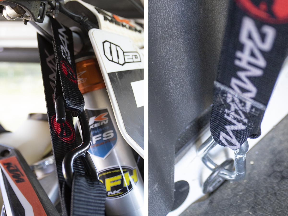 En général, les sangles nous paraissent toutes identiques et pourtant… Aujourd’hui, on est tous devenus sensibles au morceau de sangle supplémentaire permettant d’attacher la moto sans rayer le guidon par exemple. Outre ce que l’on appelle donc le « Soft-strap » chez 24MX permettant de sauvegarder l’aspect « neuf » du guidon, les penseurs suédois ont sorti une sangle large, gage de qualité et un mousqueton pour attacher à l’opposé du guidon pour éviter que la sangle ne se détache de manière intempestive. Recherche de la perfection en quelque sorte pour un produit de consommation quotidienne !