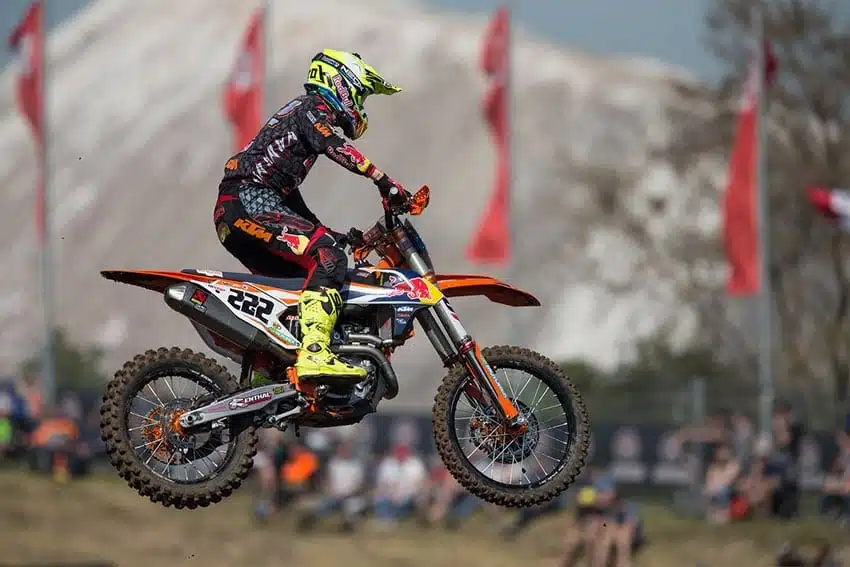 Sans doute l’officiel KTM n’était-il pas le plus vite dans l’absolu ce week-end. Mais, d’une, il a été bien aidé par de super envolées. Nickel. Ensuite, Tim Gajser, en première manche, s’est un peu « cassé les dents » sur le Sicilien. Il a attaqué, il est même passé devant, mais son aîné a su lui faire entendre raison : après deux-trois frayeurs, on a vu le Slovène préférer assurer la seconde place. En seconde manche, à nouveau aux avant-postes, la Honda 243 a cette fois été accrochée par sa « sœur » n°777 en perdition qui, involontairement, l’a flanquée au sol. Reparti aux alentours du dixième rang, le champion du monde MX2 en titre, comme la semaine dernière en Lettonie, a alors entamé une remontée express qui l’a mené jusqu’en quatrième position, de quoi assurer la seconde marche du podium. Et le leadership provisoire au championnat : en effet le pilote Honda, arrivé avec un point de retard sur Romain Febvre, est reparti avec huit unités d’avance.