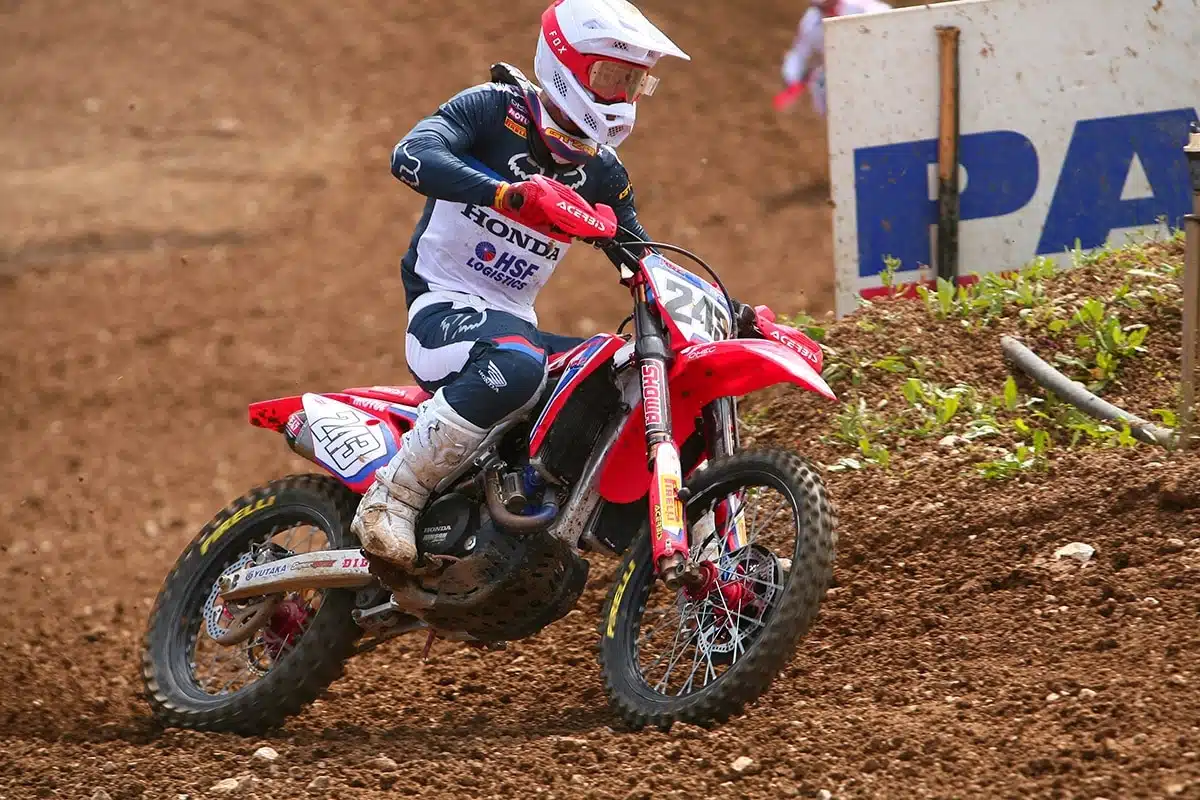 Auteur du holeshot, le Champion du Monde Jorge Prado a encore une fois signé la course parfaite. Pourchassé par le belge Jago Geerts pendant toute la manche, l’Espagnol n’eut qu’à forcer son talent sur la fin de course pour se mettre à l’abri du pilote Yam qui commençait à se montrer menaçant. Derrière, les positions sont restées figées entre la triplette Jacobi, Evans, Vialle. Ces trois-là ont roulé à la queue leu leu, peinards, pendant 15 minutes, pour forcer leur talent dans les derniers tours. Mais sans changer de places. Ils finissent devant Thomas Kjer Olsen qui a signé une belle remontée en revenant de la 14e place à la 6e place. Côté français, Brian Moreau et Maxime Renaux peuvent eux aussi s’estimer satisfaits de leur journée : le pilote Bud Racing, 9e au premier tour est parvenu à grappiller deux places avant de céder devant le retour de Olsen et Watson. Quant au nordiste, il a signé une remontée solide du mid-pack jusqu’au top 10. Mathys Boisramé et Zach Pichon ont tous deux chuté (Mathys pointait à la 14e place après un mauvais départ alors que Zach tenait une belle 15e place) alors qu’Enzo Toriani finit 20e et Jérémy Hauquier 28e.
