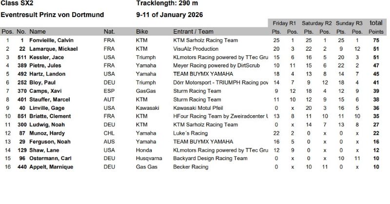 En SX2, le week-end a largement tourné à l’avantage de Calvin Fonvieille. Le Français a frappé fort dès vendredi en remportant la première finale, avant de récidiver le samedi soir, confirmant son statut de favori. Le dimanche, le pilote KTM a poursuivi sur sa lancée avec un score de 2/1/1 en Triple Crown. Seul Jules Pietre, Prince ici même l’année dernière, a réussi à lui subtiliser une manche, empêchant le perfect, mais sans remettre en cause la domination de Calvin. Ce dernier s’adjuge logiquement le titre de Prince of Dortmund 2026.