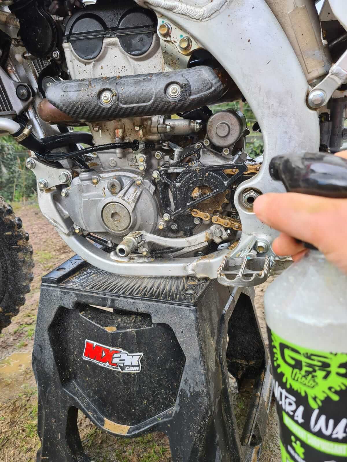 Lors de notre test, nous avons appliqué GS27 Ultra Wash sur toute la moto après un premier coup de jet haute pression pour dégrossir. Après un temps de pose d’environ 10 minutes, le temps de faire un filtre à air puis repassage au jet haute pression.