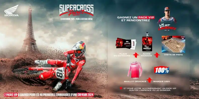 Pour une durée limitée de quatre semaines, du 8 octobre au 2 novembre, Honda France propose une offre exclusive aux 40 premiers acquéreurs d’une CRF450R modèle 2024 : bénéficier non seulement d’un tarif très spécial, mais également d’une expérience unique pour deux personnes au Supercross de Paris, à la rencontre, entre autres, de la star Jett Lawrence.