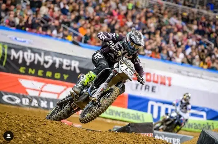 A commencer par Jacob Hayes, le champion Arenacross 2018. Jacob Hayes a fait un beau retour en SX l’an dernier et cette année, et fait partie de ceux qui peuvent prétendre à un guidon d’usine si les étoiles sont alignées… Des étoiles, Hayes a du en voir quelques unes car il s’en ait mis une bonne qui devrait lui laisser un peu de temps pour refléchir : fracture ouverte du fémur, rotule cassée, et une petite fracture aussi dans le poignet.