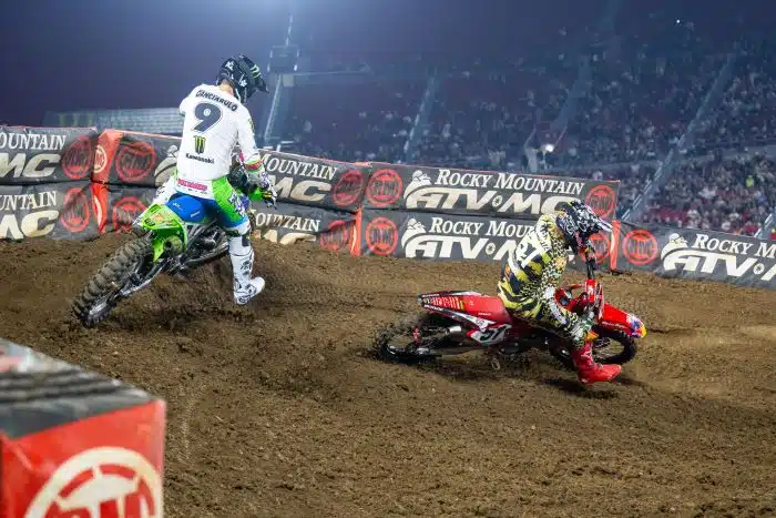 Il aurait peut-être pu faire encore mieux lors de la finale disputée au mythique Coliseum de Los Angeles, sans un énorme par l’avant dès le premier tour de la première finale, alors qu’il venait de passer en tête en doublant l’auteur du holeshot Adam Cianciarulo. D’après ce qu’on peut voir de la chute, Justin Barcia a légèrement perdu l’adhérence avant l’appel de l’enchaînement où il s’apprêtait à faire triple, et n’a jamais réussi à ramener l’assiette de la moto. Un nouveau coup dur pour le pilote GASGAS, puisque la sanction est lourde : « quelques côtes cassées, le clavicule fracturée, un poumon abimé de l’air dans la poitrine », selon sa propre déclaration sur Instagram. Dur, pour un pilote qui en était encore à revenir au top après une blessure.