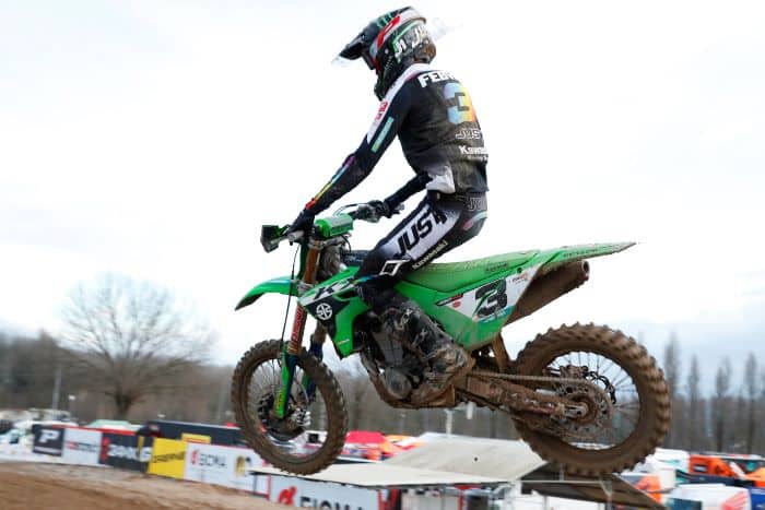 Dès le premier départ MX1, Tim Gajser a donné le ton en s’offrant le holeshot, avant de disparaitre petit à petit de la vue de ses camarades, notamment son coéquipier Ruben Fernandez, puis les deux Kawasaki officielles de Jeremy Seewer et Romain Febvre. Romain termine troisième de cette première manche, après avoir doublé Seewer.