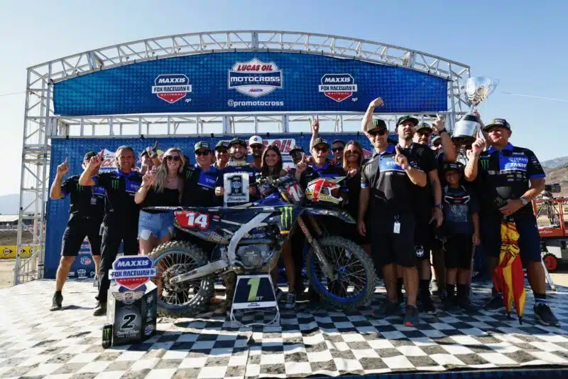 Dylan Ferrandis : C’est une saison tellement géniale ! Comme tu l’as dit, je n’ai jamais vraiment essayé de penser à ce championnat parce que pour moi, c’est quelque chose que je n’ai jamais cru pouvoir faire. Je m’entraîne toujours et j’essaie d’être le meilleur, mais pour ma première saison en 450, avec une nouvelle équipe… je ne m’attendais pas vraiment à gagner. Donc, sûr, j’ai été surpris toute la saison des résultats. Évidemment, aujourd’hui, notre objectif était de gagner le championnat, mais on ne sait jamais ce qui peut arriver. Toute la saison a été une grande surprise, et finir comme ça, une course avant la fin, c’est tellement irréel. Honnêtement, c’est le meilleur sentiment qui soit. J’étais un peu dans le dur émotionnellement parce que j’ai tellement travaillé que j’ai juste eu l’impression que c’était une semaine normale. On a gardé la même quantité d’effort que d’habitude. Je me sentais presque comme si c’était normal, mais ça ne l’était pas vraiment. Donc, ça m’a fait un peu bizarre de monter sur le podium. Je pense que demain matin, quand je me réveillerai, je réaliserai vraiment ce qui s’est passé. C’est juste génial, génial pour moi, génial pour tous les gens de Yamaha et tous les gens impliqués dans le programme. C’était vraiment top. La piste était vraiment bien aujourd’hui à Pala. J’ai apprécié les conditions de course. Je pense que la météo a été vraiment, vraiment difficile pour moi aujourd’hui, personnellement. C’était dur. Les deux derniers tours ont été vraiment, vraiment difficiles pour moi. Je pense qu’avec la fin de la saison qui arrive, c’est juste dur physiquement pour tout le monde. Nous avons vu tellement de pilotes être très fatigués lors des derniers courses. C’est vrai pour moi. Après Ironman, j’étais vraiment fatigué, et encore aujourd’hui après la première manche. J’étais vraiment vidé, et j’ai dû puiser dans mes réserves dans la deuxième manche pour finir devant. Je suis content de l’avoir fait.
