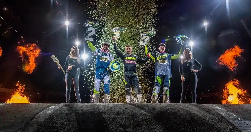 « En fait, je suis moi même un peu surpris de cette victoire. L’Arenacross anglais est une série très relevée où l’on voit les têtes d’affiche du championnat de France de SX, plus quelques bons inter comme l’Australien Dan Reardon, le Russe Evgeny Bobryshev, le Portugais Hugo Basaula… et à la base, je me disais qu’accéder déjà à la finale, c’était pas mal. Le niveau est hyper homogène car les pistes ne sont pas très longues, et techniques, ce qui génère peu d’écart entre les pilotes.