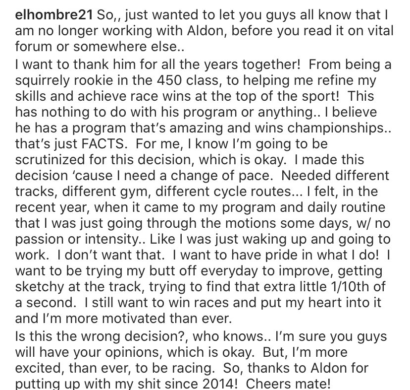 On sait le programme très exigeant mentalement et physiquement, mais aussi très efficace. C’est ainsi sous les directives d’Aldon que JA21 a remporté son titre de Supercross US en 2018. Depuis, El Hombre avait déjà largement pris ses distances avec La Boulangerie, passant la plupart de son temps en Californie plutôt qu’en Floride, le camp de base. Trop restrictif pour le team Fried, le programme Baker ? C’est probable, Jason n’ayant pas le profil du robot à sang froid type Dungey, au contraire. Extrait du message de Jason Anderson : “Je veux le remercier pour toutes ces années ensemble. (…) ça n’a rien à voir avec le programme, je pense que le programme est incroyable et gagne des championnats. (…) Je sais que je vais être observé avec attention après cette décision, mais j’ai besoin d’un changement de rythme.(…) Nouveaux terrains, nouvelles boucles de vélo, nouveaux exercices de gym. (…) Ces dernières années, j’avais l’impression d’être tombé dans la même routine quotidienne sans passion et intensité. Comme si je me levais et aller au boulot. Je ne veux pas de ça, je veux de la fierté dans ce que je fais.”