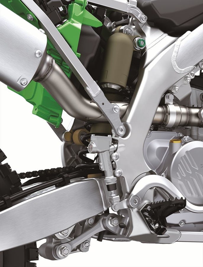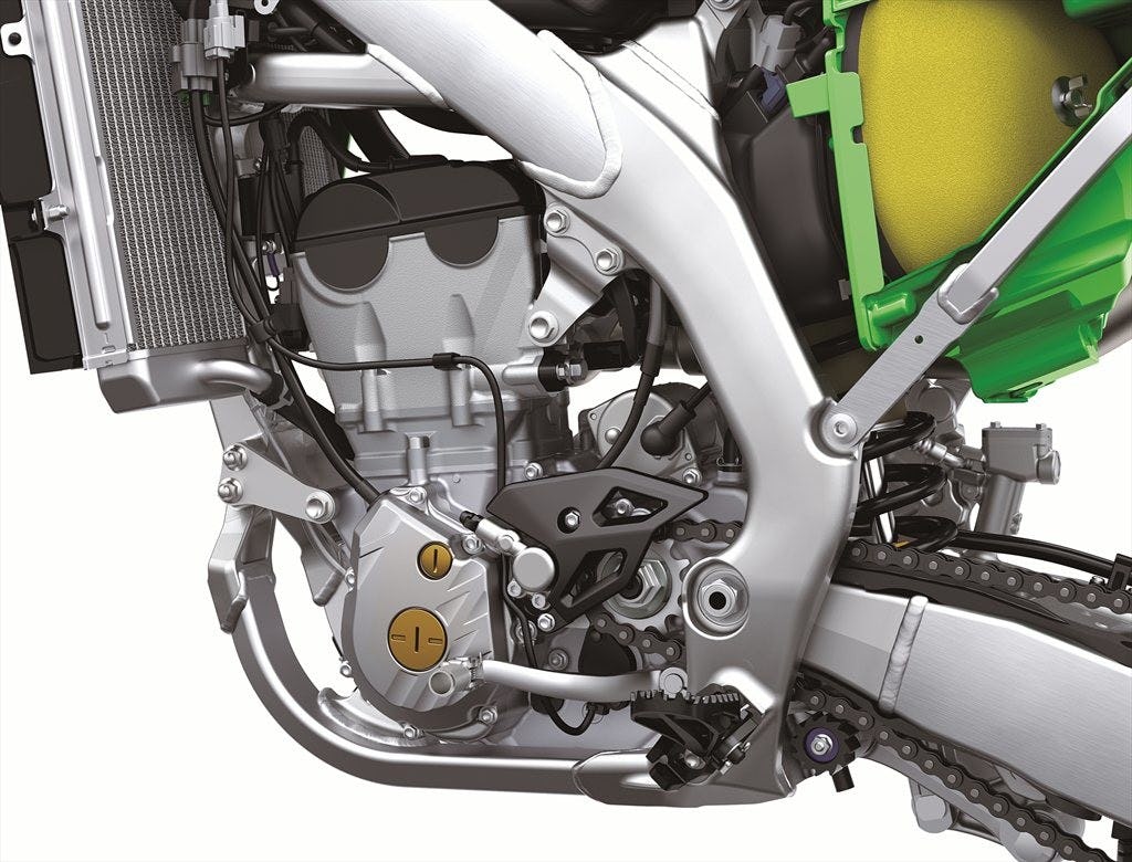 Si la 450 de la gamme n’évolue que sur quelques points de détails mineurs (nouveau matériau sur la robe du piston pour une meilleure lubrification, embrayage revu avec disque plus gros de 146 mm au lieu de 139 mm), la 250, elle, est globalement totalement nouvelle et s’appuie sur le châssis de la 450, même si les attaches de cadre sont différentes. Le bras oscillant est lui aussi commun avec la 450. Le moteur est nouveau, avec une culasse et un cylindre revus, un piston plus plat et une nouvelle chambre de combustion. Sans oublier évidemment l’embrayage hydraulique et le démarreur électrique ! Selon Kawasaki, le moteur permet de monter plus haut dans les tours et dispose de plus de puissance. Comme on peut le voir sur les images, les plastiques sont différents du modèle 2020, reprenant le design de ceux des 450.