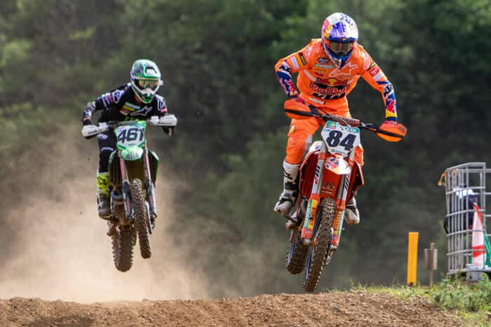 En MX2, Tom Vialle a sans surprise gagné les deux manches. Je dis sans surprise, parce que Tom est le champion du monde en titre, mais il a tout de même dû s’employer pour y arriver. Car dans les deux manches, il a un temps été mis sous pression par Mathys Boisramé dans la première, puis Thibault Bénistant dans la seconde. Mais, comme c’est très souvent le cas, Tom n’a jamais paniqué, s’appliquant tour après tour à rester dans les même chronos. On peut penser également que Tom n’a pas cherché à forcer son immense talent, et au final lui n’a pas commis d’erreurs et signe un doublé impeccable.