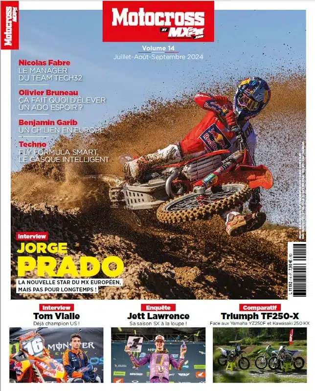 Le Motocross by MX2K #14 vient de sortir, avec une fois encore un tas de longs sujets à dévorer. Notamment une interview de la nouvelle star du MX européen Jorge Prado, qui s’apprête pourtant à partir aux USA. Autant en profiter tant qu’il est encore là ! En parlant d’USA, le nouveau champion SX 250 côte est, notre Français Tom Vialle, a le droit lui aussi à son interview après sa magnifique saison SX, tout comme Vincent Bereni, le boss du nouveau mais efficace team Triumph.