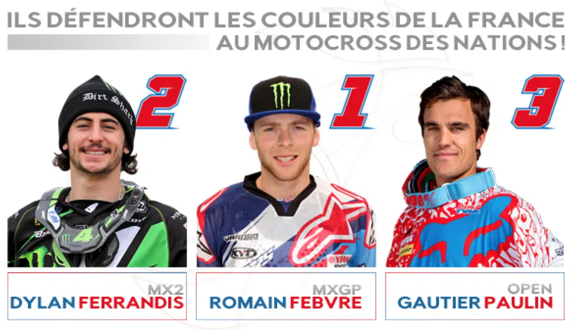 Le communiqué officiel de la Fédération Française de Motocyclisme est tombé mardi : « Sur proposition de l’Entraîneur National, voici la composition de l’Équipe de France définie par la Fédération Française de Motocyclisme pour le Motocross des Nations 2016 qui se déroulera à Maggiora (Italie), les 24 et 25 septembre prochains : 1/ Romain Febvre (Yamaha, MXGP), 2/ Dylan Ferrandis (Kawasaki, MX2), 3/ Gautier Paulin (Honda, Open). Pilote remplaçant : Benoît Paturel (Yamaha, toutes catégories). L’Equipe de France visera la victoire lors de cette compétition ».