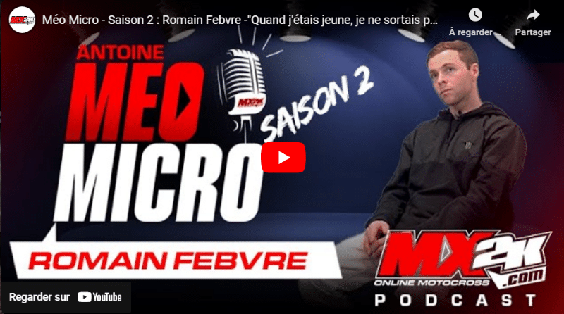 Méo Micro saison 2, ça continue ! Après le premier épisode de cette nouvelle saison avec Marvin Musquin, que l’on peut retrouver en cliquant ici, Antoine Méo reçoit pour cette épisode 2 un véritable guerrier des circuits : le Vosgien volant Romain Febvre ! Pilote au talent brut et au mental d’acier, il s’est tout de suite imposé parmi les meilleurs en mondial MXGP, remportant même le plus prestigieux des titres en Europe en 2015, sur une Yamaha officiel du team Rinaldi, pour sa première saison dans la catégorie reine. Un fait assez rare pour être signalé ! Dans cet épisode 2 de Meo Micro, Romain Febvre revient ainsi sur son parcours aussi tortueux qu’atypique, ses plus belles victoires, mais aussi sur tous ces moments difficiles qui ont forgé son caractère et font une carrière. Anecdotes de paddock, coulisses du championnat et état d’esprit d’un champion, tout y est ! Un épisode à déguster sur place ou à emporter avec un de nos pilotes les plus capés.