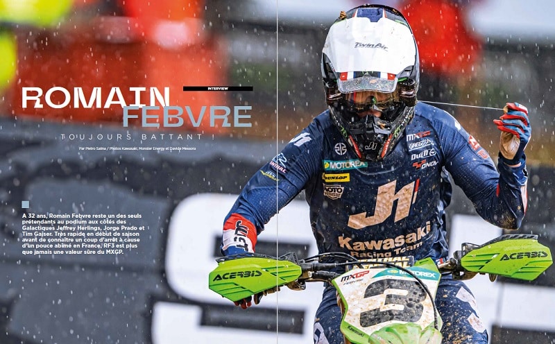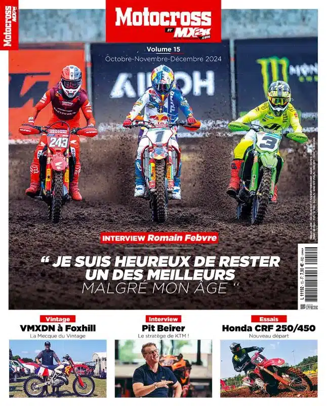 Le #15 de notre magazine Motocross by MX2K donne la parole à Romain Febvre, notre plus sûr représentant en MXGP, mais aussi à notre voisin suisse Valentin Guillod, qui se bonifie avec le temps comme le bon vin, ou encore à Pit Beirer, l’homme qui se cache derrière les succès sportifs de KTM. On vous présente sous forme de portrait deux espoirs, l’Américain Chance Hymas, et la jeune française April Franzoni. Côté matos, on a testé pour vous les nouvelles Honda 250 et 450 CRF 2025, ainsi que la Kawasaki KX250 entièrement remaniée. Enfin, focus sur le renouveau de la marque Fantic, l’aventure d’un Français au VMXDN à Foxhill et le premier test exclusif du gilet airbag Shot SGR-1. À ne pas manquer !