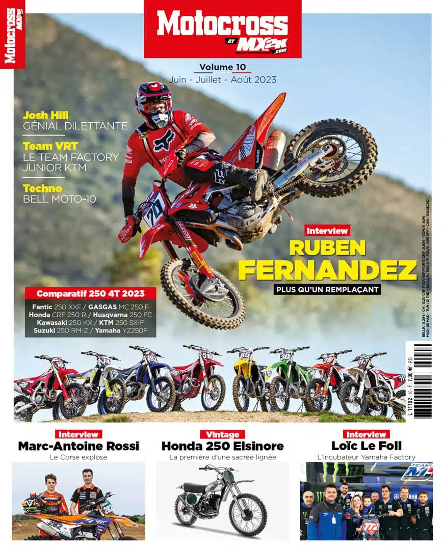 le comparatif géant des 250F 2023 est à l’affiche, avec l’aide de l’excellent breton Romain Pape. Enfin, une pensée pour les aînées, avec à l’honneur la Honda 250 Elsinore, première d’une longe lignée.