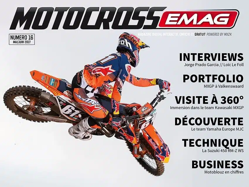 Le seizième numéro de notre magazine digital gratuit, Motocross Emag, vient de paraître avec au programme une interview du phénomène Jorge Prado Garcia, une visite virtuelle à 360° de la structure MXGP Kawasaki. Nous avons aussi rendu visite à l’équipe Yamaha Europe MJC et nous sommes rencardés sur la Suzuki 450 officielle qui préfigure la moto de série de 2018. Enfin si vous aimez le business et les chiffres, foncez lire notre article sur Motoblouz, le leader de la VPC moto en France.