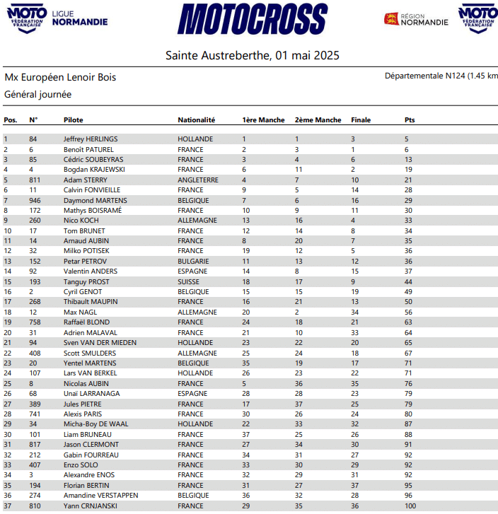 Pour sa 67e édition, le MX Inter de Sainte-Austreberthe a frappé fort en annonçant Jeffrey Herlings en guest star. Le légende du MX mondial n’a pas déçu sur le très atypique circuit normand, en s’imposant au classement général avec deux victoires de manche et une troisième place, le tout sous un soleil radieux et une température estivale. Jeffrey a toutefois dû composer avec un Benoit Paturel décidément en forme suite à sa préparation américaine, qui termine deuxième de la classique du 1er mai en ayant remporté l’ultime manche.