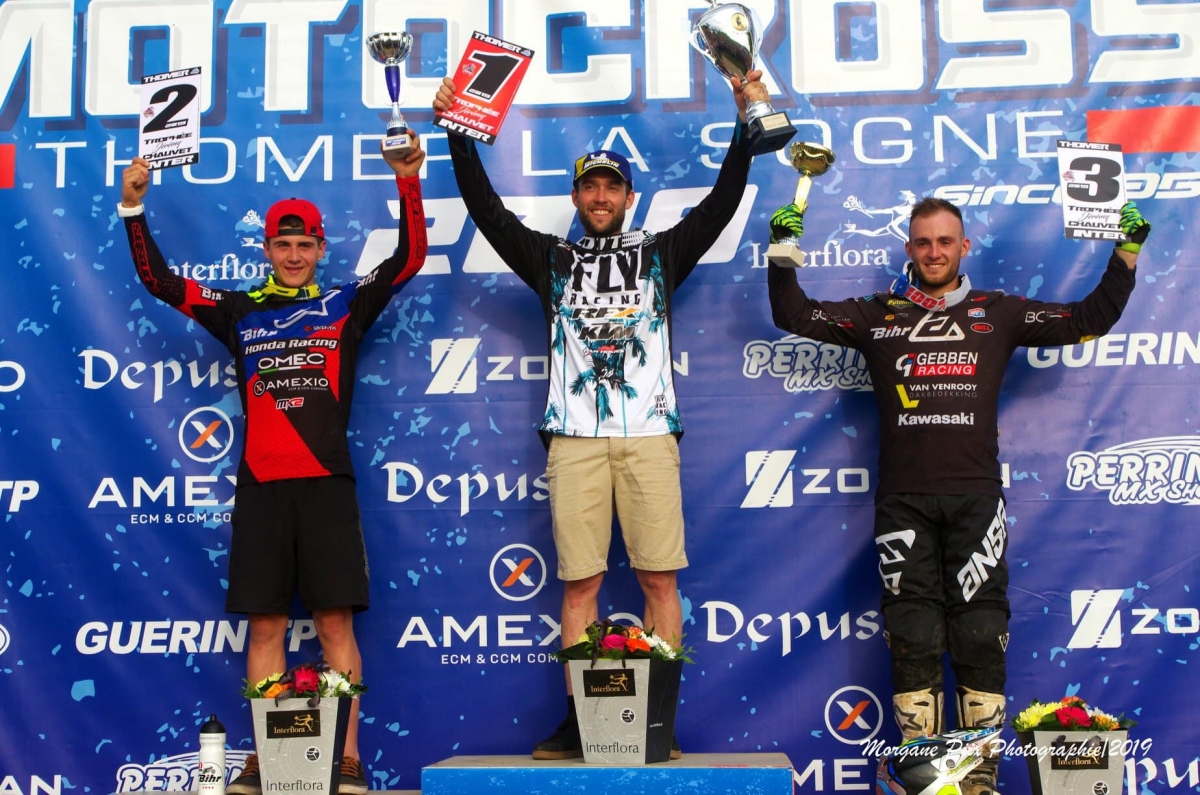 Du soleil, du public, un plateau de qualité, une piste aux petits oignons, tout était réuni pour que le cross de Thomer-la-Sogne perpétue la tradition des grandes courses inter où il fait bon passer un jour férié. Cette année, dans l’Eure, c’est l’Anglais Shaun Simpson qui inscrit son nom sur les tablettes au terme d’une journée quasi parfaite puisqu’il remporte les deux et troisième manche après avoir fini second de la première. Avec en rab la Superpôle en poche ! Derrière lui, on retrouve Zachary Pichon, 1-2-8, impressionnant tout au long de la journée au guidon d’une Honda 450 CR-F. Benoit Paturel, vainqueur l’année dernière, complète le podium de la journée à la faveur d’un 3-4-4. Un bon retour aux affaires pour le néo pilote Kawa.