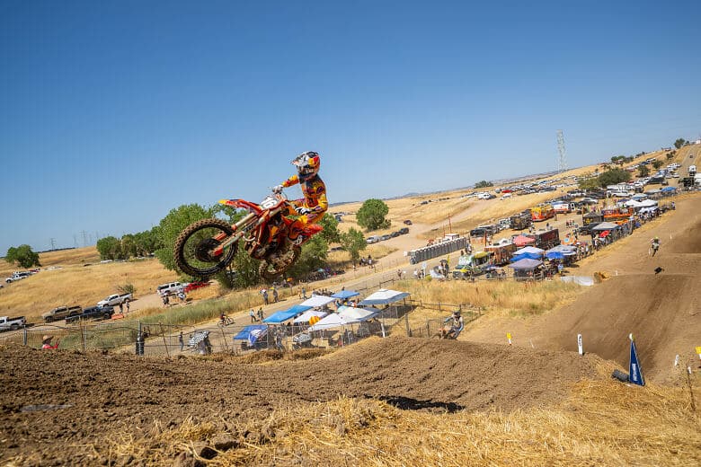 Deuxième round du MX à Hangtown, avec cette fois encore des courses divertissantes dans les deux catégories. Et, au final, les mêmes vainqueurs, à savoir Jett Lawrence et Haiden Deegan. Sur une piste relativement plate, par rapport aux autres années, les descentes et les virages en bas ayant été exceptionnellement refaites. Le tout sous une chaleur de gueux, environ 40°. De quoi commencer à travailler le body summer pour les pilotes ! On rappelle aux moins connectés que Chase Sexton n’était pas là, suite à son crash à Pala (oui, facile, je sais), et pourrait bien ne revenir que fin juin, après le break qui suit Highpoint.