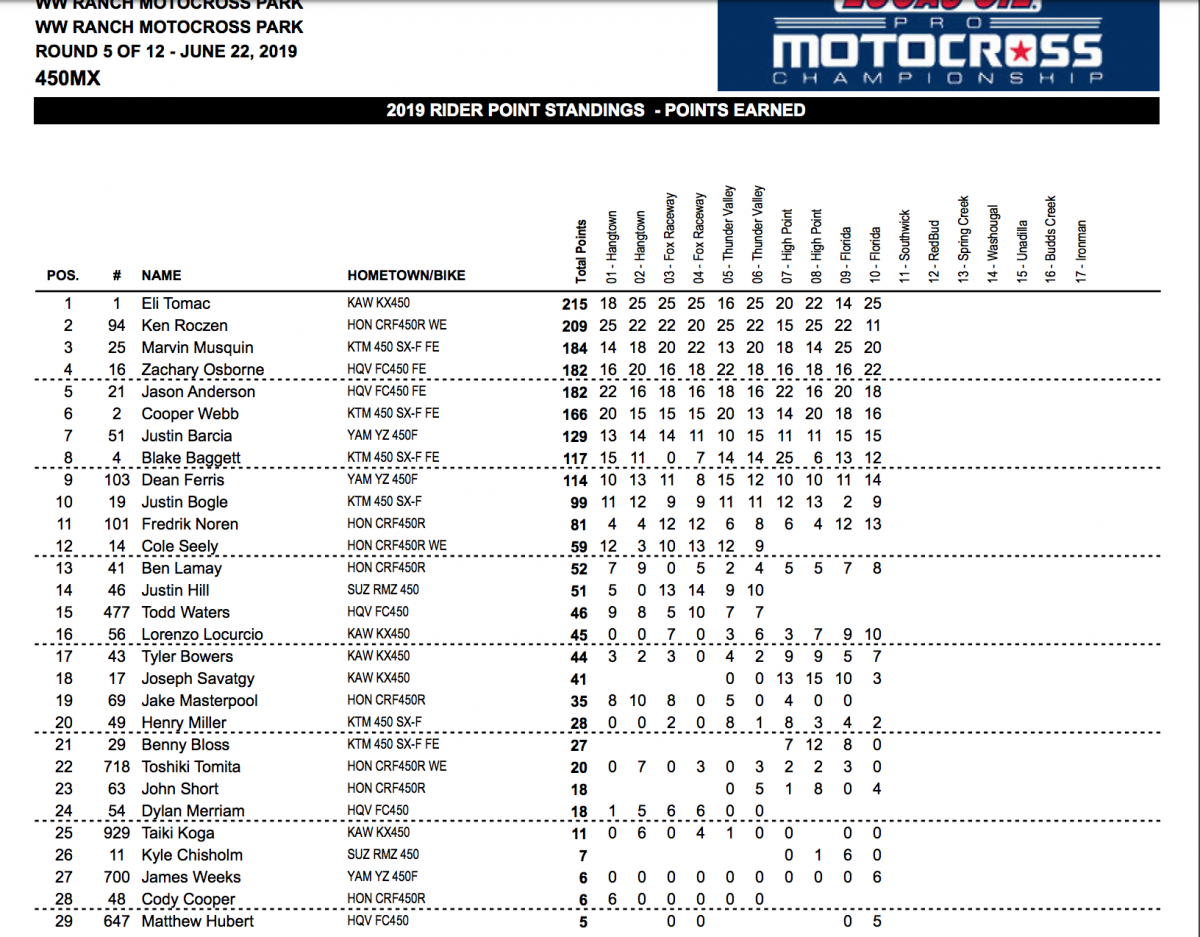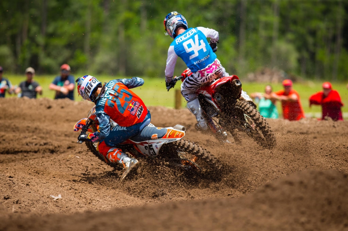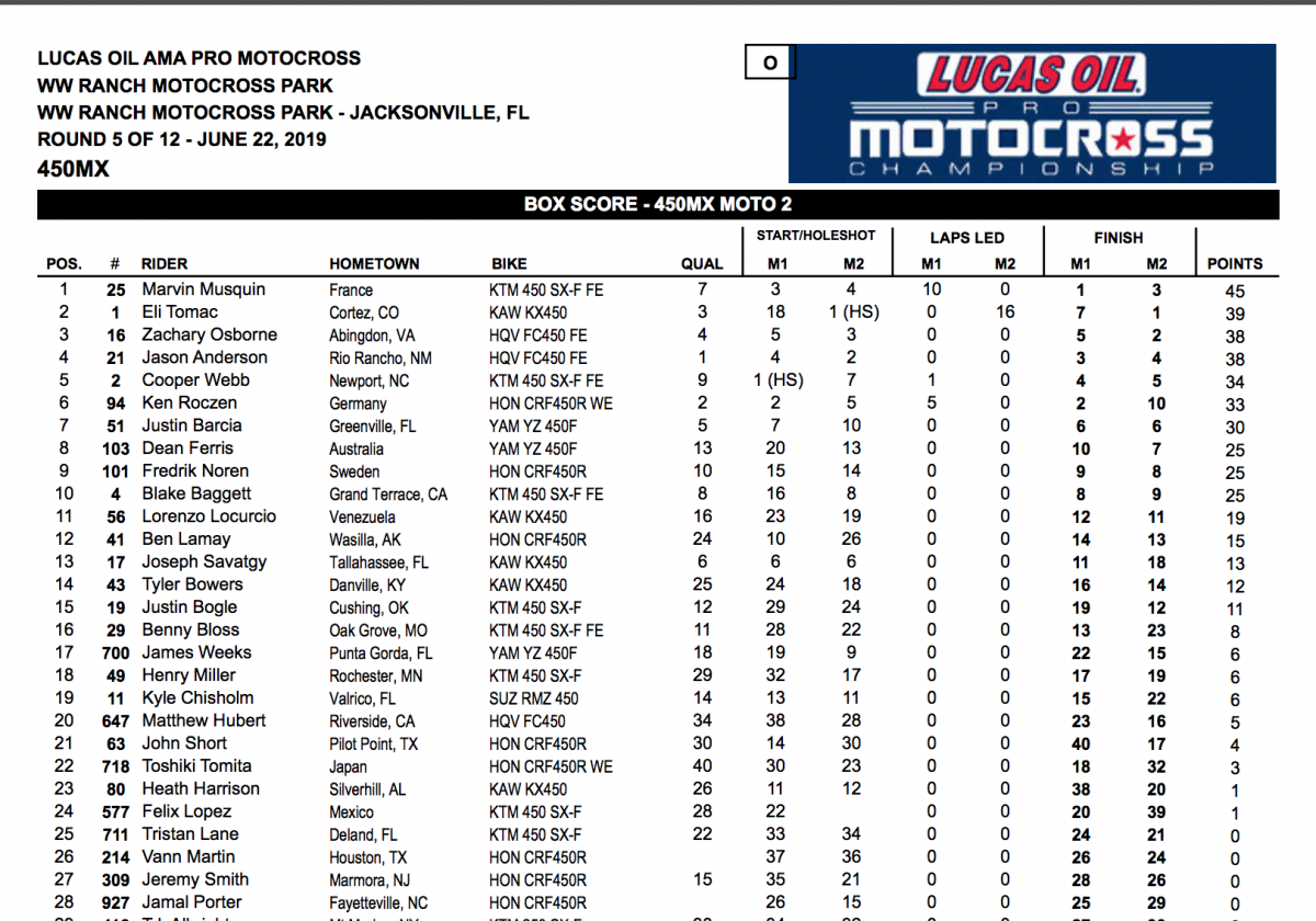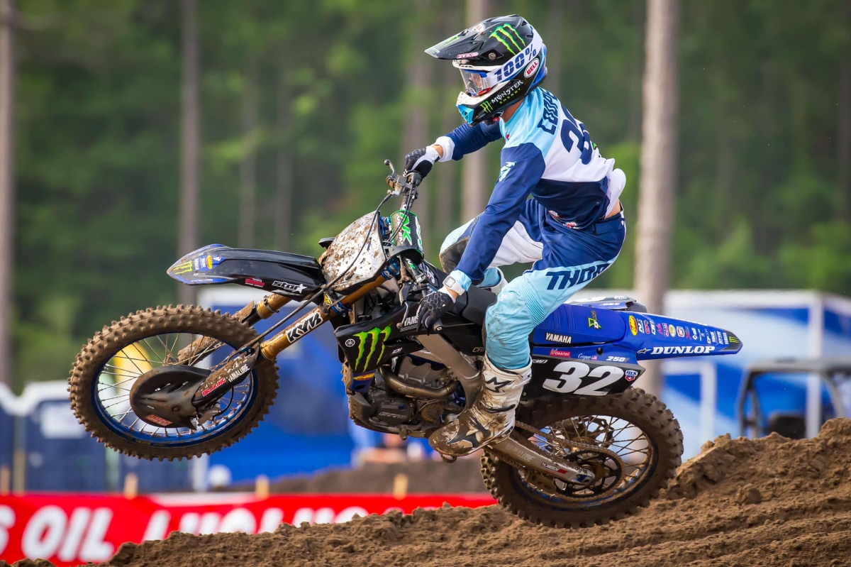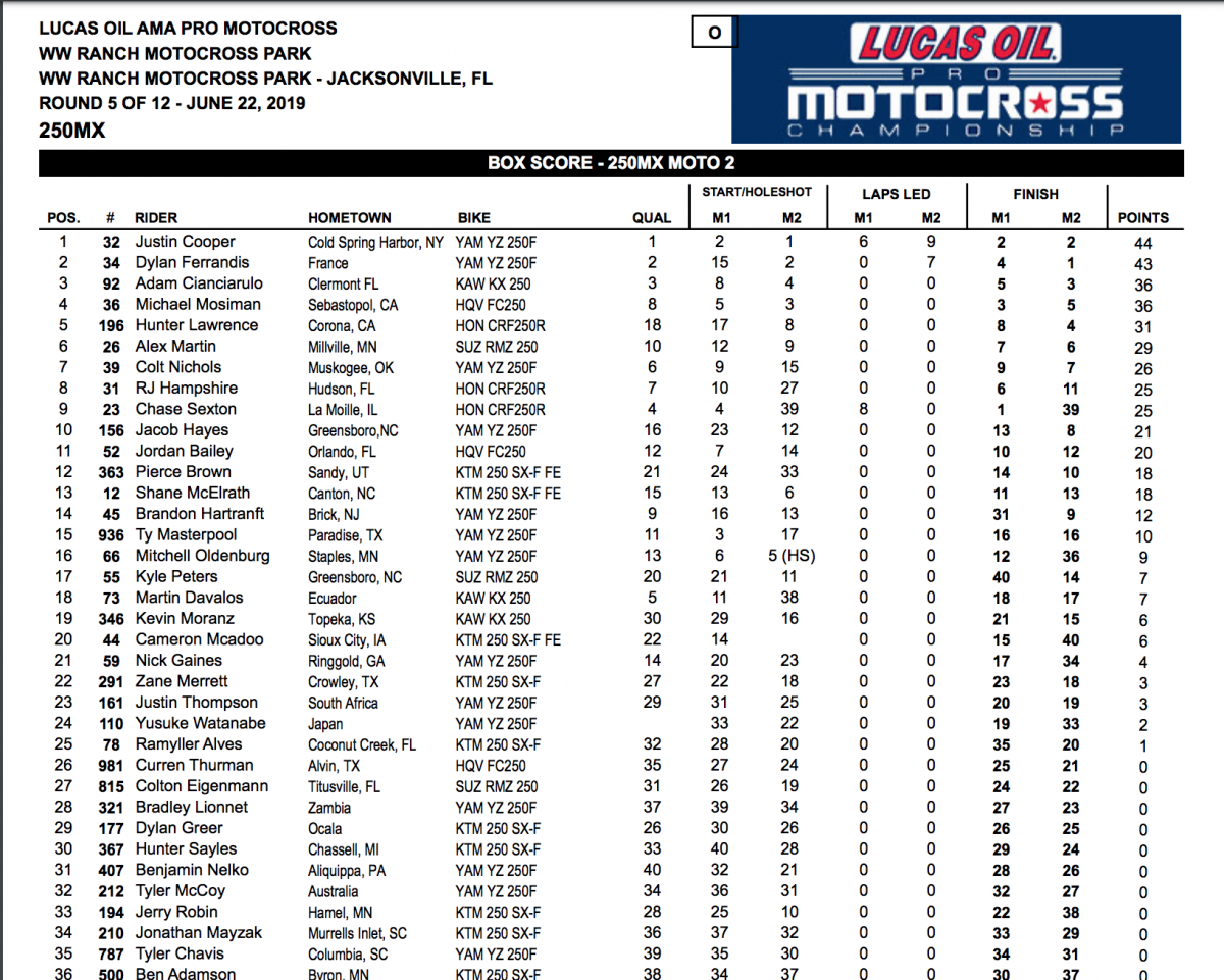 Dylan Ferrandis a montré l’étendu de son talent sur la piste sablonneuse de Jacksonville, en Floride, qui accueillait la première épreuve du National US de son histoire, mais ça n’a pas suffit pour lui permettre de remporter le général. Ceci par la faute d’un premier départ exécrable qui l’a contraint à pointer à la 14e place au premier départ. Il reviendra 4e en doublant pas mal de pointures, sauf Chase Sexton, Justin Cooper et Michael Mosiman qui finiront dans cet ordre, mais ce ne sera pas suffisant au général. Car en face de lui, Dylan a eu affaire à Justin Cooper qui, lui, a enchaîné deux départs de rêve aux avant-postes. Résultat, le coéquipier de Dylan signe un beau 2/2 qui lui permet de décrocher sa première victoire sur le National de sa carrière. L’homme a de la ressource comme a pu le constater Dylan lors de la seconde manche puisqu’il lui a fallu plus de 20 minutes pour en venir à bout ! Ouf ! Troisième avec un correct 5/3, Adam Cianciarulo a payé ses départs moyens qui l’ont contraint à faire sa place dans le top 5 même si en vitesse pure, il n’a jamais pu rivaliser avec le duo de pilotes Yam et le malheureux Chase Sexton qu’on ne verra pas s’aligner au second départ, semble-t-il accablé par la chaleur de Floride…