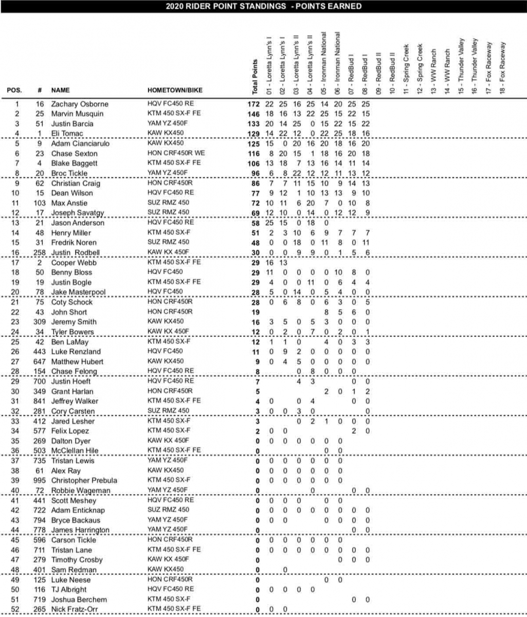 En 450, deux holeshots et deux courses solides pour Zach Osborne lui ont permis de solidifier sa plaque rouge, lui qui avait laissé quelques plumes la semaine dernière. Zacho est rapide, solide et se bat pour chaque point. Il va falloir aller le chercher ! Superbe podium de Chase Sexton, second avec un score de 3 et 4 plein de panache, toujours en bagarre. Il devance Justin Barcia et Marvin Musquin, à égalité de score (6/2 contre 2/6). Les deux coéquipiers de chez Kawa Adam Cianciarulo et Eli Tomac ont eux aussi animé la course, mais si AC9 a montré de belles choses en revenant aux avant-postes après des erreurs, Tomac n’a pas paru aussi saignant que d’habitude… A suivre.