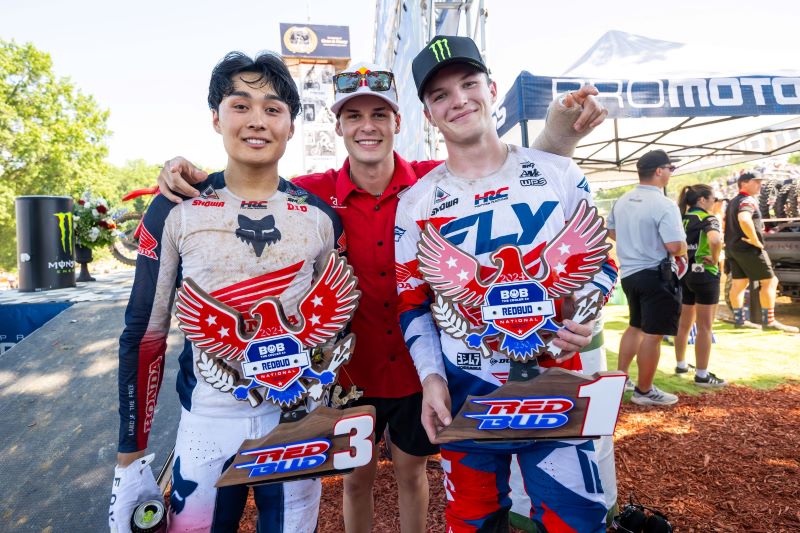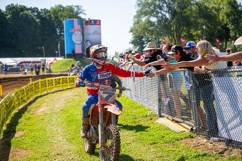 Impressionnant depuis le début de la saison, Chance Hymas a coché les cases petit à petit : d’abord plus rapide au chronos, ensuite vainqueur de manche, et le voici maintenant qui remporte son premier MX US à RedBud, devant un public en transe. Et avec la manière, qui plus est. Parti deuxième derrière Tom Vialle en première manche, Hymas a saison sa chance en déboîtant le Français avec autorité, puis en le laissant sur le bas-côté. Ensuite, il a un peu craqué physiquement, semble-t-il, et termine quatrième en limitant les dégâts. Par contre, personne n’a pu le revoir dans la deuxième, si ce n’est son coéquipier Jo Shimoda qui a réussi à combler une partie du retard, mais le jeune a su résister. Avec style, en plus. Coudes bien hauts, bonne posture, en contrôle, le jeune, auteur du meilleur temps en course les deux manches, est aussi plaisant sur la piste qu’au micro, ce qui change un peu. Au championnat, il reste même devant Tom Vialle à la deuxième place, malgré avoir sauté sous drapeau Croix Rouge, perdant cinq points dans l’affaire. Attention à lui dans cette fin de championnat !