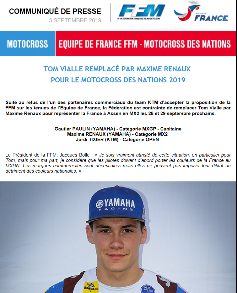 La Fédération Française de Moto n’a pas plié. Et RedBull non plus ! Ni l’institution fédérale, ni la boisson énergisante, n’ont pris le téléphone ce matin pour trouver un arrangement dans ce qui est devenu depuis hier soir l’affaire “Tom Vialle” : une dommageable histoire de visibilité de logos sur les équipements de la sélection française. Ni l’un, ni l’autre, n’ont voulu céder en reduisant la taille de leurs marquages, par principe, ce qui nous vaut ce communiqué tout frais annonçant le remplacement de Tom Vialle par Maxime Renaux. Une triste affaire pour les valeurs du sport, Tom ayant gagné sa légitimité au sein de l’EDF, en signant une saison exceptionnelle. Heureusement, Maxime a lui aussi été méritant…. On pourra aussi se dire pour éviter de sombrer dans un profond désarroi que cette situation ne se devrait pas se reproduire puisque la FFM à demandé à la FIM de réglementer les espaces réservés aux partenaires commerciaux des teams et des pilotes sur les équipements et tenues des équipes nationales pour le MXDN dans un proche avenir.