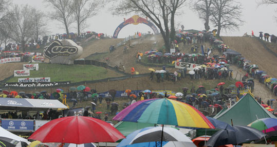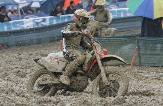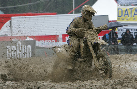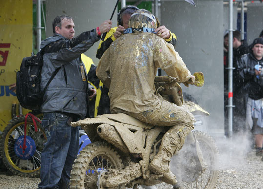 Pour les MX1 le scénario va être le même. C’est Steve Ramon qui pointe en tête à la fin du premier tour. Mais la pluie redouble et la piste devient totalement impraticable. Les positions ne cesseront de changer. Beaucoup de pilotes choisiront d’ailleurs de passer par les stands pour changer de gants, enlever la boue sur la moto ou prendre une paire de lunette neuve.