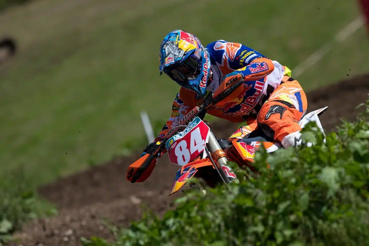 Le mano a mano entre Cairoli et Herlings a pris une autre dimension ce dimanche en Angleterre. En effet, le hollandais s’est montré très agressif face à Cairoli, principalement en première manche où l’italien va se faire percuter par son coéquipier en toute fin de manche et chuter. Herlings était certes plus rapide que Cairoli, mais l’action n’était pas très clean. Dans la seconde manche, Cairoli va de nouveau se faire déborder par Herlings en fin de manche et laisser JH84 scorer un nouveau doublé.