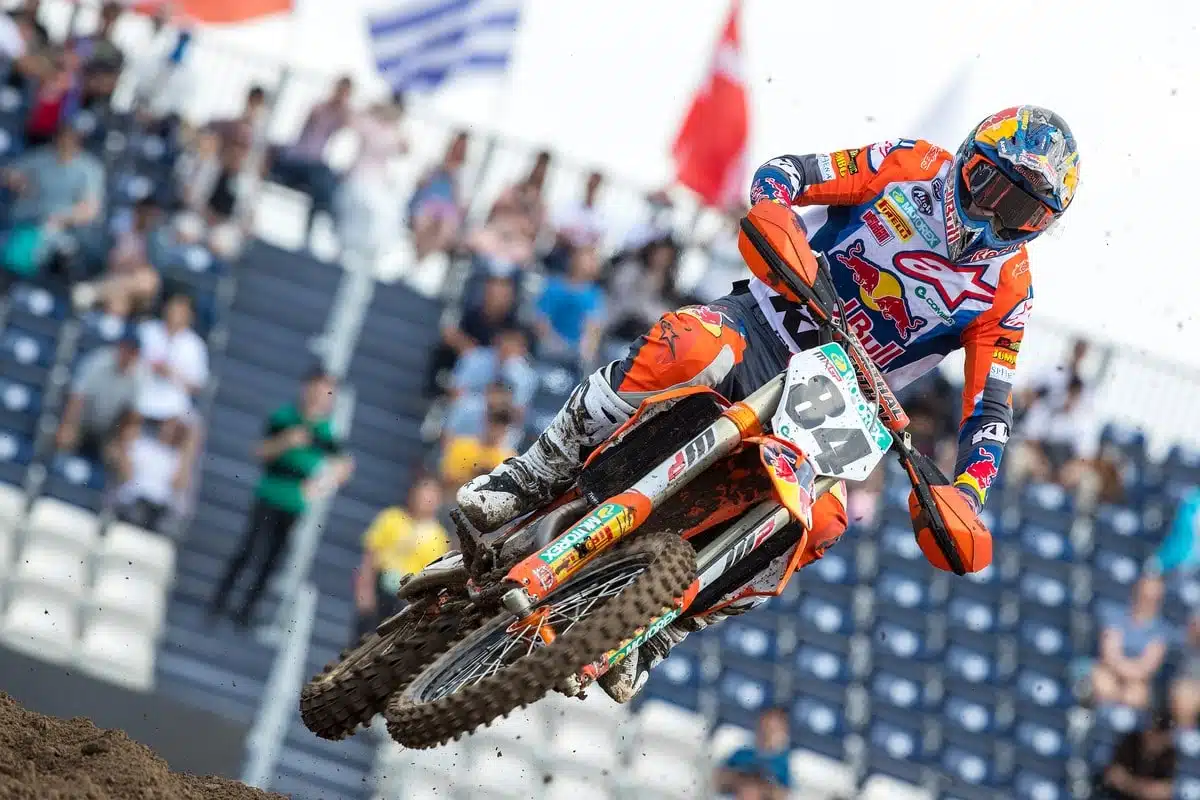Second de la première manche après avoir croisé le fer avec Seewer et Gajser, Jeffrey Herlings aura encore une fois pris la mesure de Glenn Coldenhoff dans les derniers mètres de la seconde course pour lui subtiliser la victoire au général. Comme en Turquie. De quoi se les mordre pour le pauvre Glenn qui avait signé à nouveau un superbe week-end. Vif au départ, rapide et sûr ensuite, le Hollandais avait dominé chacune des deux manches… jusqu’à ce que ce diable d’Herlings place un dernier coup de rein. Du coup, c’est un nouveau doublé batave qui squatte le classement de la journée, juste devant Jeremy Seewer qui a connu une journée contrastée. L’officiel Yamaha a animé les devants des courses, avant de chuter deux fois en première manche, et de faiblir dans la seconde… Idem pour Tim Gajser, 4e du GP. Il n’a pu contenir Herlings et surtout, il a encore une fois fauté, aujourd’hui en accrochant un panneau publicitaire lors du second débat. Côté Français Gautier Paulin score un honorable 7/6, mais insuffisant pour résister au retour de Coldenhoff sur le podium final, alors que Jordi Tixier signe son meilleur GP avec un régulier 9/9.