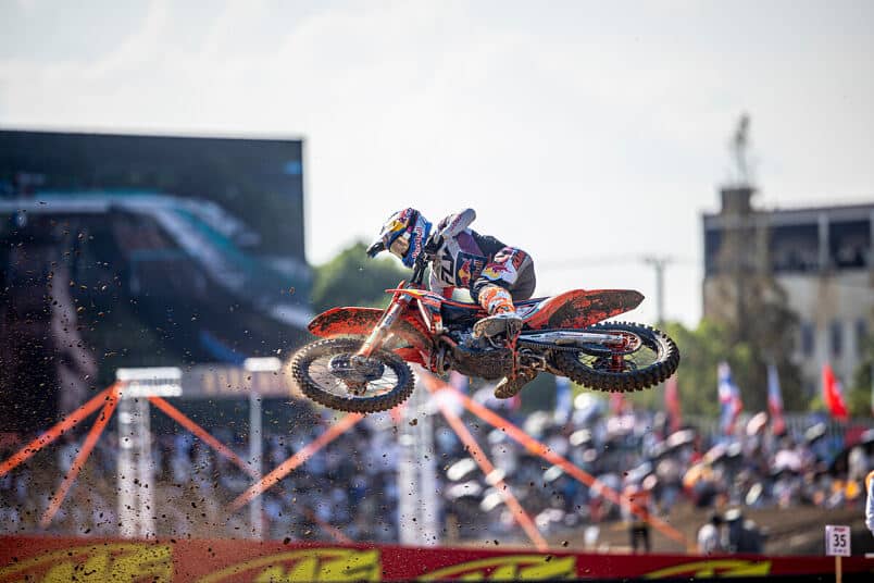 « Je l’ai fait, mais honnêtement en ce moment je me sens comme un poulet qui a passé une heure sur le barbecue. La chaleur a été vraiment dure. Venant de Hollande, je ne suis pas habitué à ces conditions. Chez moi, il faisait 12–13 degrés, et ici, le choc a été énorme. Tenir la vitesse, ça allait, mais la chaleur m’a vraiment épuisé. Tim [Gajser] m’a mis la pression tout le week-end, dans chaque manche, et ce n’était pas simple du tout. Peut-être que ça a paru facile, mais c’est l’une des victoires les plus difficiles pour moi. Remporter trois Grands Prix d’affilée après seulement six semaines de reprise, je suis vraiment heureux de ça. Cela montre à quel point le niveau est relevé, même avec moins de pilotes derrière la grille, la qualité est toujours très haute. »