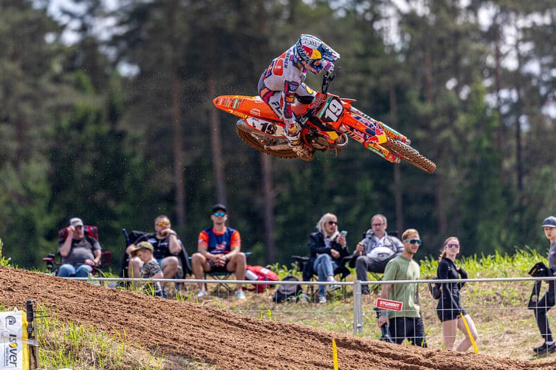 En MX2, Sacha Coenen débloque enfin son compteur, avec une journée solide. Auteur du holeshot en première manche, le Belge a été chercher une belle victoire de manche devant son coéquipier Simon Längenfelder et Liam Everts, dans une course marquée par beaucoup de chutes, dont celles de Kay de Wolf (8e) et d’Andrea Adamo (11e). Bien parti, Mathis Valin prend une bonne quatrième place. Top 10 pour Quentin Prugnières, et 20e place pour Maxime Grau.