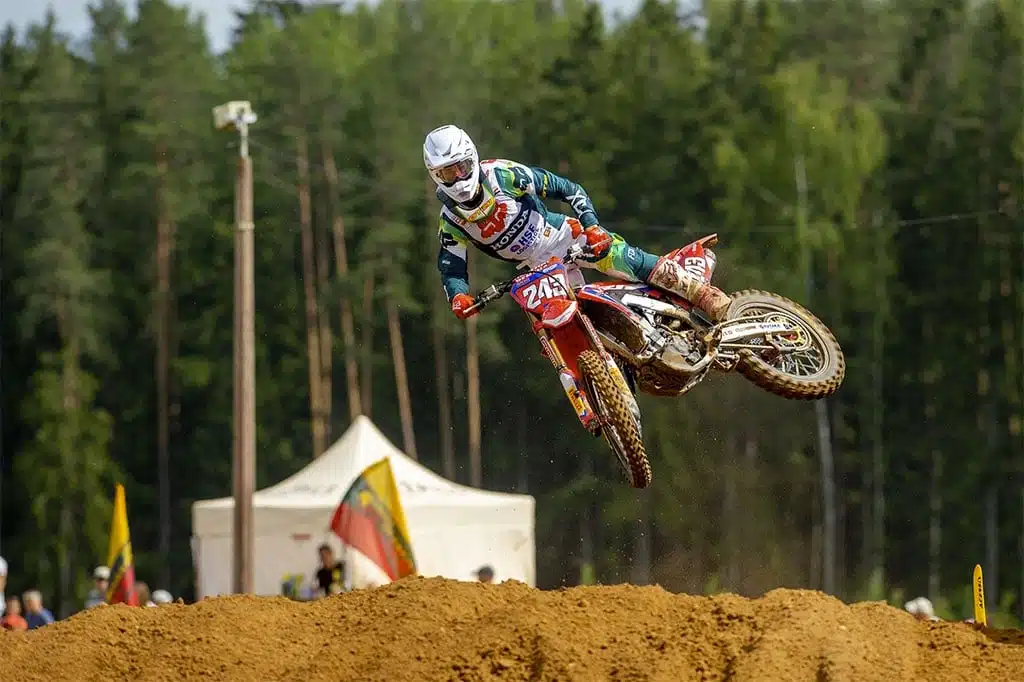 Tim Gajser enregistre un nouveau succès à Kegums où il remporte son cinquième grand-prix de la saison. En plus de sa victoire, le pilote Honda HRC profite de l’abandon de Cairoli (lire ci-dessous) pour prendre le large au championnat.