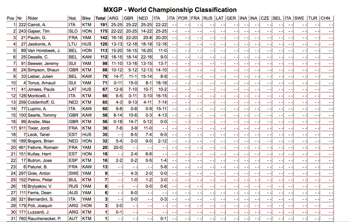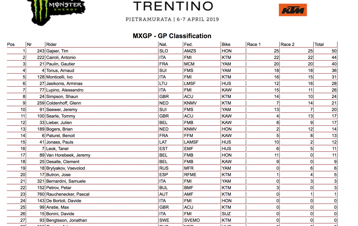 Le plus beau GP de la saison ! Merci à Tim Gajser d’avoir animé ce GP d’Italie, et par la même relancé ce championnat, qui était promis à un Antonio Cairoli dominateur depuis le début de la saison. Chauffé à blanc par une armée de spectateurs dévoués à sa cause, le Slovène lui a opposé une magnifique résistance, se permettant même de lui chiper la première manche en le doublant à quatre tours de la fin. Un exploit qui a tendu le nonuple champion du Monde italien qui en seconde manche s’est dépouillé pour remettre les pendules à l’heure. Cela nous a valu une seconde course encore plus belle que la première, les deux hommes jouant au chat et à la souris pendant 30 minutes. Jusqu’à ce qu’Antonio, survolté après avoir repris la tête, grimpe un peu haut sur un appui et perde le contrôle de sa KTM. Une image insolite et un fait de course qui permet au Solvène de renouer avec la victoire et on l’espère de relancer l’intérêt de la saison. Troisième homme de la journée, Gautier Paulin a mis à profit ses deux excellents départs même s’il n’a pu que suivre à distance le duel des deux titans puisqu’il finit à près de 50 secondes du vainqueurs dans les deux manches. Il précède son coéquipier Arnaud Tonus, auteur de son meilleur GP de la saison avec deux quatrièmes places et Ivo Monticelli, en verve devant son public. Enfin, mention spéciale pour Benoit Paturel qui a finit deux fois dans les points avec une 16e et une 13e place.