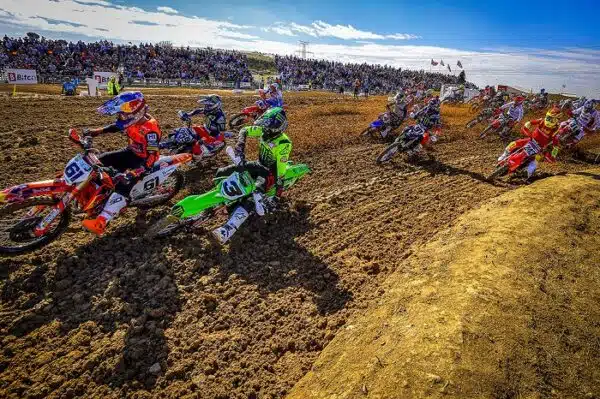 Dans la première manche MXGP, c’est Prado qui s’est emparé du Holeshot Fox devant Romain Febvre, Glenn Coldenhoff et Tim Gajser. Herlings s’est un peu loupé, avec un départ au-delà du top 10. Febvre s’est vite frayé un chemin jusqu’à la roue arrière de Prado avec Gajser proche mais pas assez pour attaquer. Au neuvième tour, Romain Febvre a enfin trouvé l’ouverture sur un Prado pas décidé à se laisser faire devant son bruyant public. Derrière, Herlings est au boulot pour remonter. Tim Gajser, lui, bute sur Prado, et finit dans les dernières minutes par aller à la faute, de quoi permettre à un Herlings qui a mis le turbo dans les derniers tours de revenir dans sa roue, puis de la doubler.