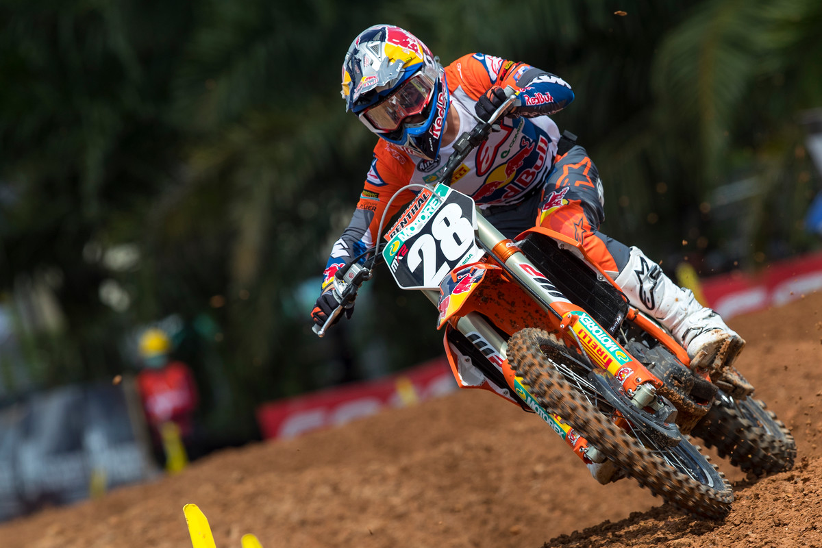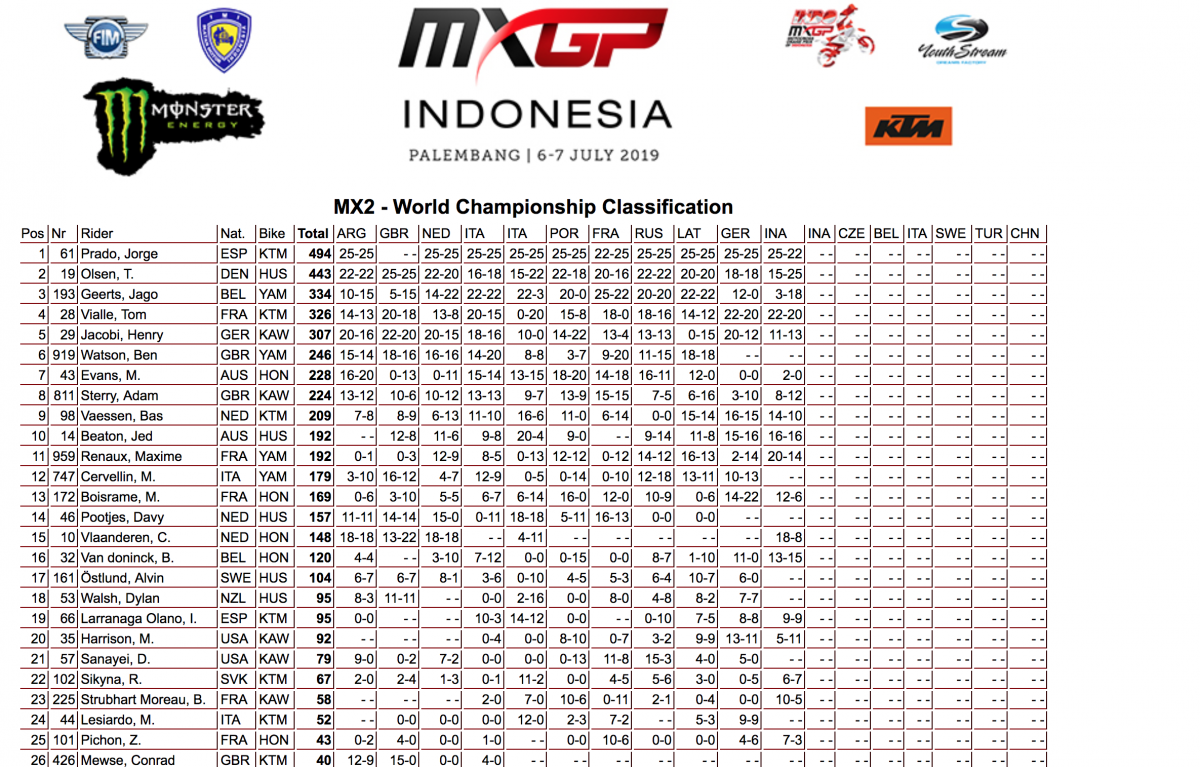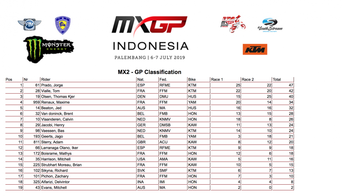 Vainqueur de la première manche, Jorge Prado n’a pas dispensé son récital habituel lors de la seconde. Parti devant, l’officiel KT s’est fait doublé par une bande d’énervés, Jago Geerts, Thomas Kjer Olsen, Tom Vialle, Jed Beaton et Brian Strubhart ce qui a laissé penser que le World champ’ n’avait pas supporté la chaleur régnant sur le tracé de Palembang après sa première manche où il a dû supporter 35 minutes durant la pression de Tom Vialle, impressionnant de vitesse et de constance. Il aura fallu 15 minutes pour que l’Espagnol se mette en branle, retrouve sa vitesse habituelle et remonte jusqu’à la seconde place au drapeau à damier derrière Olsen qui a enfin réussi à vaincre à la régulière l’Espagnol. Ce dernier remporte malgré tout un nouveau GP, mais sans signer, chose exceptionnelle, le doublé. Surtout, il a manqué vaciller face à son coéquipier Tom Vialle qui a encore une fois impressionné : en première manche, le Français est parvenu à coller aux basques de Prado 30 minutes durant, et en seconde, il a joué devant toute la manche en restant accrocher à la troisième place pendant toute la course malgré le pressing de Prado… Tom avait même le général en poche pendant une bonne partie de la manche ! Autre source de satisfaction dans le clan tricolore, les courses de Maxime Renaux qui, troisième du premier débat, est parvenu à remonter jusqu’à la 7e position dans le second malgré un départ mid pack. Il finit du coup 4e du GP, son meilleur résultat de la saison. Mathys Boisramé (9/15), Brian Moreau Strubahrt (11/16) et Zach Pichon (14/dnf) ont de leur côté connu plus ou moins de réussite, alternant départs moyens et souci mécanique.